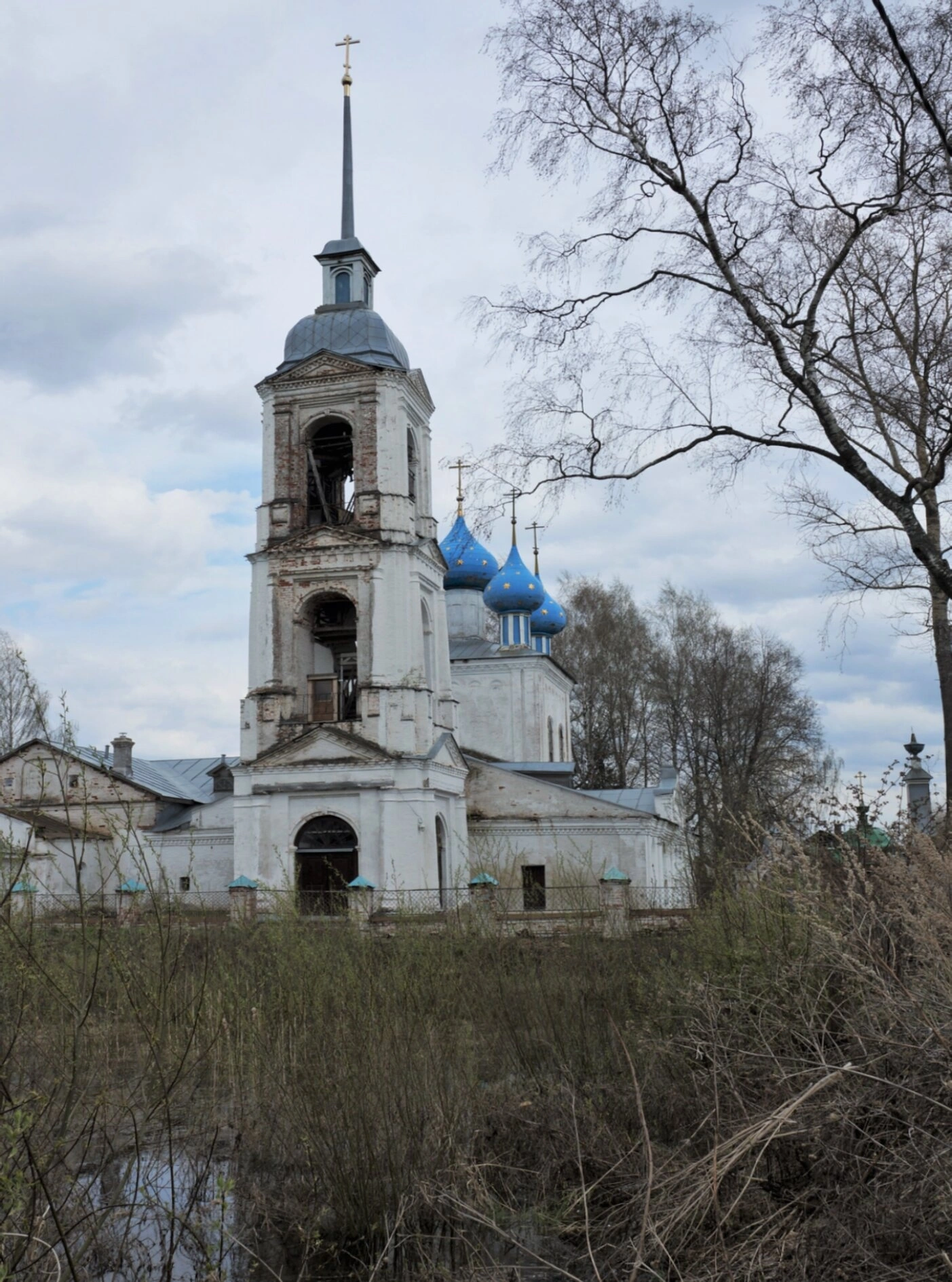 Храм окружает живописный природный ландшафт: густая растительность, деревья с обнажёнными ветвями, что указывает на весенний или осенний период. На переднем плане видны заросли кустарника и полевая трава. Пасмурное небо с облаками придаёт снимку особую лирическую атмосферу и подчёркивает величие православной святыни.