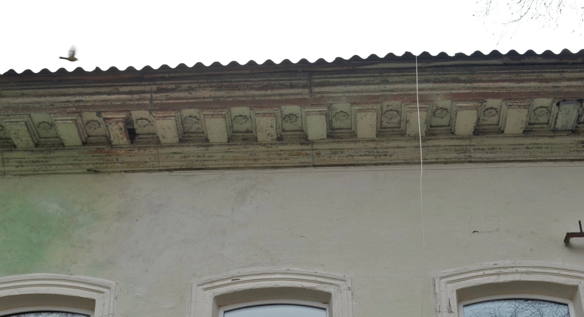 В верхней части композиции внимательный наблюдатель может различить elaborately декорированный карниз, украшенный архитектурными элементами, характерными для церковного зодчества. Под карнизом просматривается кровля, выполненная из традиционного волнистого материала, что свидетельствует о сохранении исторического облика храма.