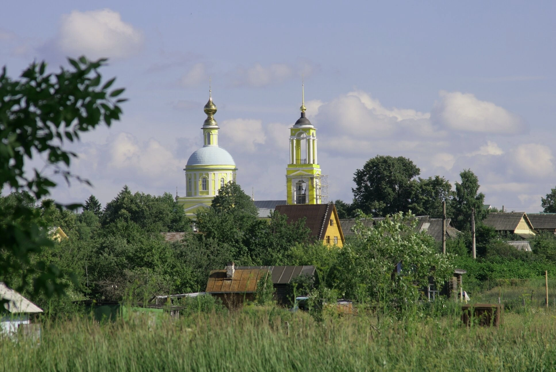 Святыня возвышается на фоне густой зелени деревьев и кустарников, которые живописно обрамляют её и частично скрывают окружающие сельские дома с крышами из тёмного дерева или шифера. На переднем плане фотографии видно поле с высокой травой, подчеркивающее уединённый и мирный характер этого святого места. Общая атмосфера изображения проникнута благодатным спокойствием и умиротворением, характерным для подмосковной глубинки в тёплое время года.