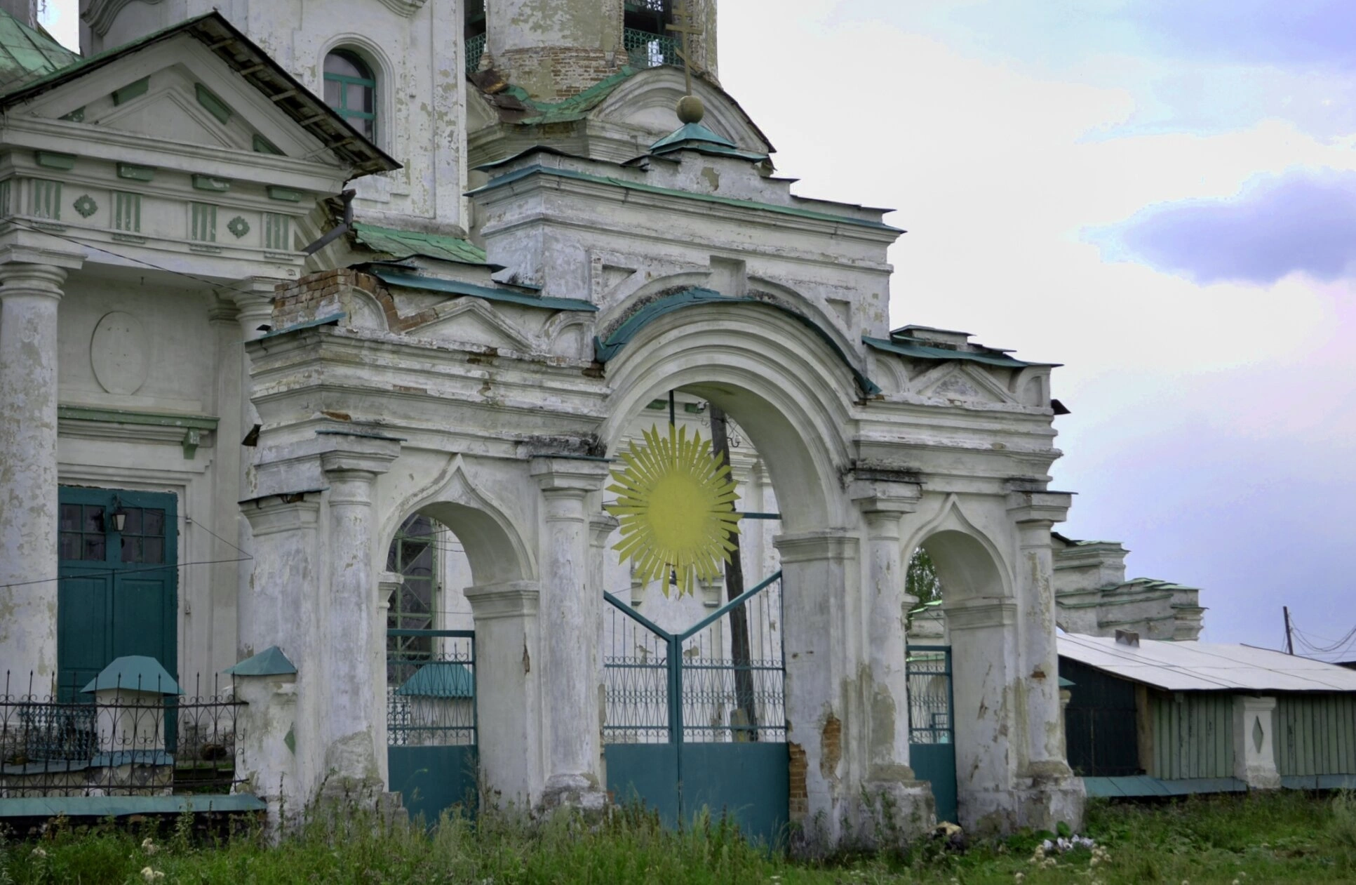 На снимке хорошо просматривается арочная конструкция главного входа, украшенная традиционным символом солнца, что характерно для храмовой архитектуры Урала XVIII столетия. Белоснежные стены храма, местами сохранившие следы времени, гармонично сочетаются с зелёными кровлями и луковичными главами, увенчанными православными крестами.