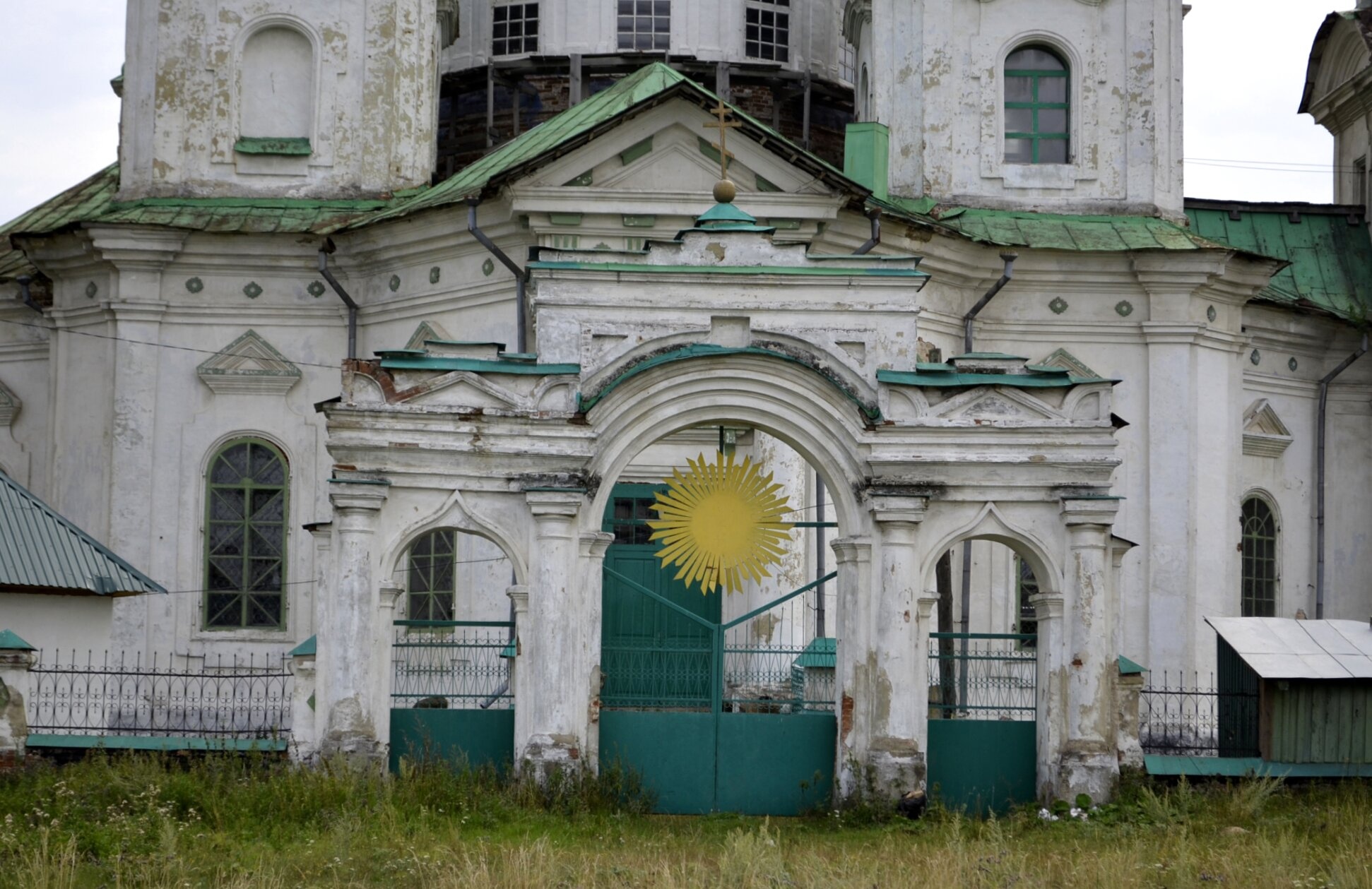 На фотографии запечатлены Святые ворота ограды Церкви Николая Чудотворца в старинном уральском селе Быньги. Этот храм, построенный в период с 1789 по 1797 год, является одним из первых каменных храмов на Среднем Урале и памятником архитектуры федерального значения. Архитектура ворот, обрамленных тосканскими полуколоннами и увенчанных килевидными архивольтами, гармонично дополняет общий ансамбль святыни.