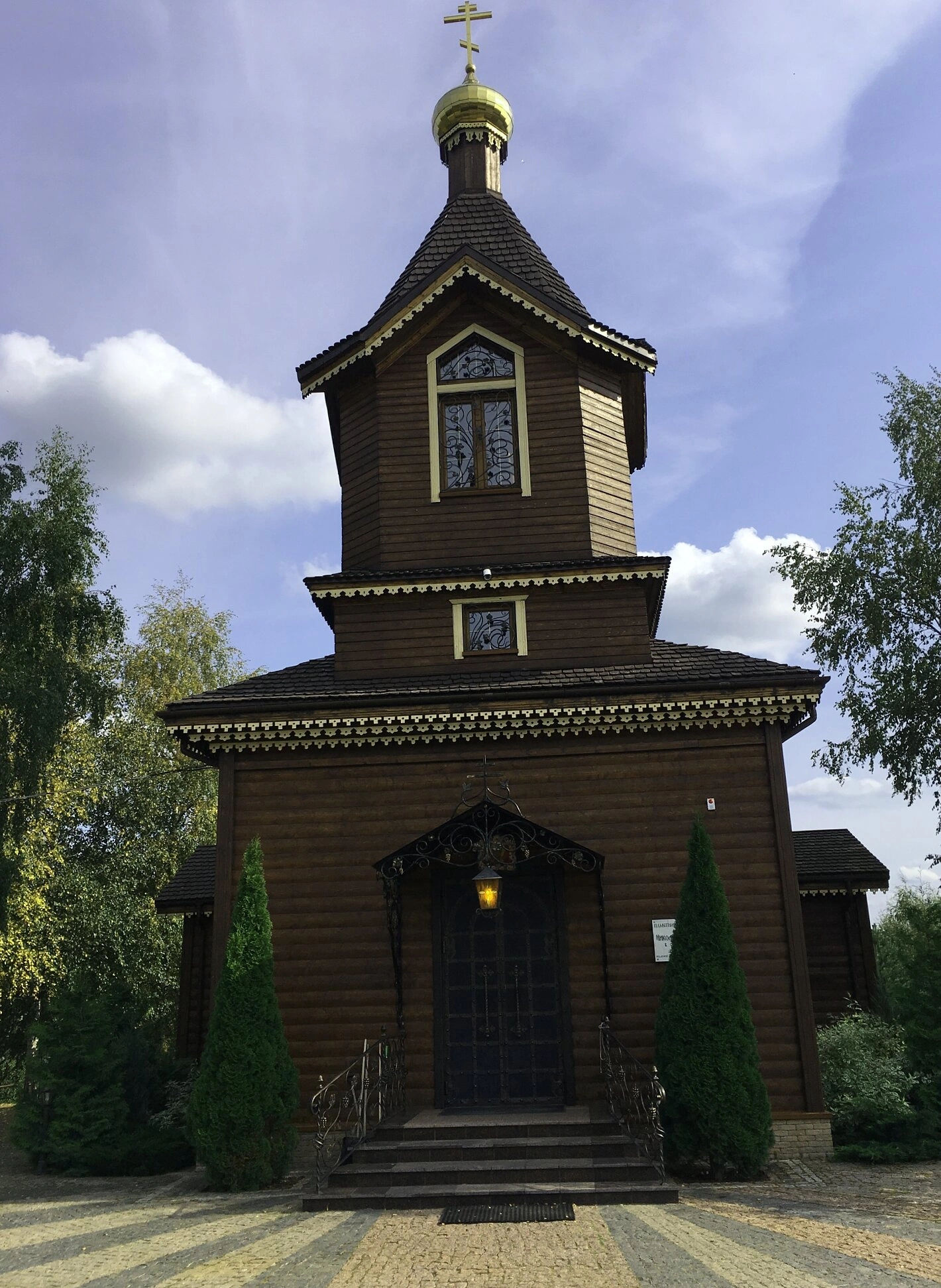 Архитектура храма выполнена в традиционном русском стиле из тёмного дерева. Основной объём церкви увенчан двускатной крышей, украшенной искусным резным декором, характерным для православного храмостроительства. Над колокольней возвышается золочёный купол, увенчанный православным крестом, символизирующим искупительную жертву Христа.