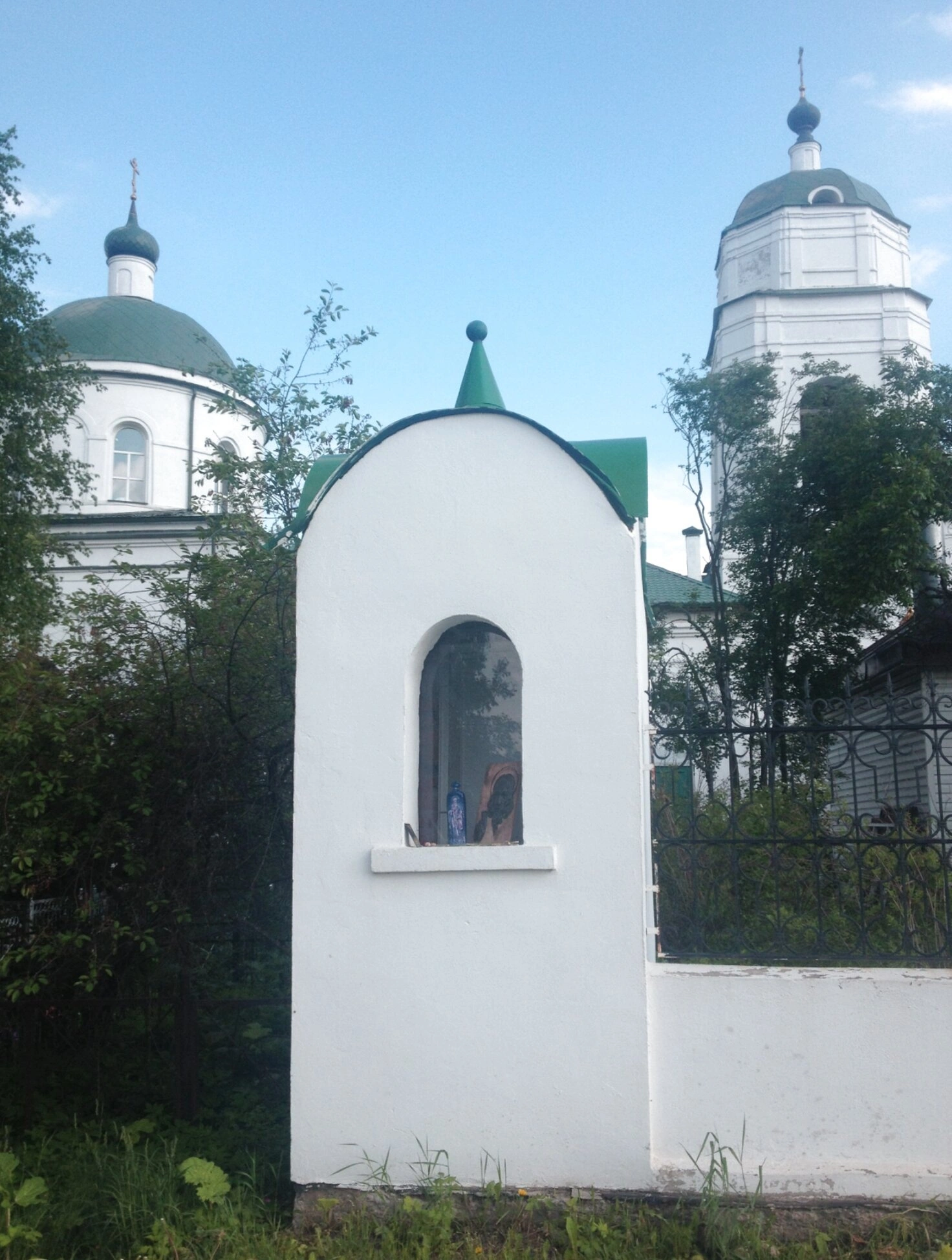 За часовней возвышается невысокая каменная ограда с изящной черной металлической решеткой, отделяющая священное пространство храма от мирской суеты. На заднем плане величественно располагаются два основных храмовых сооружения - колокольня и главный церковный объем, увенчанные зелеными куполами с православными крестами.