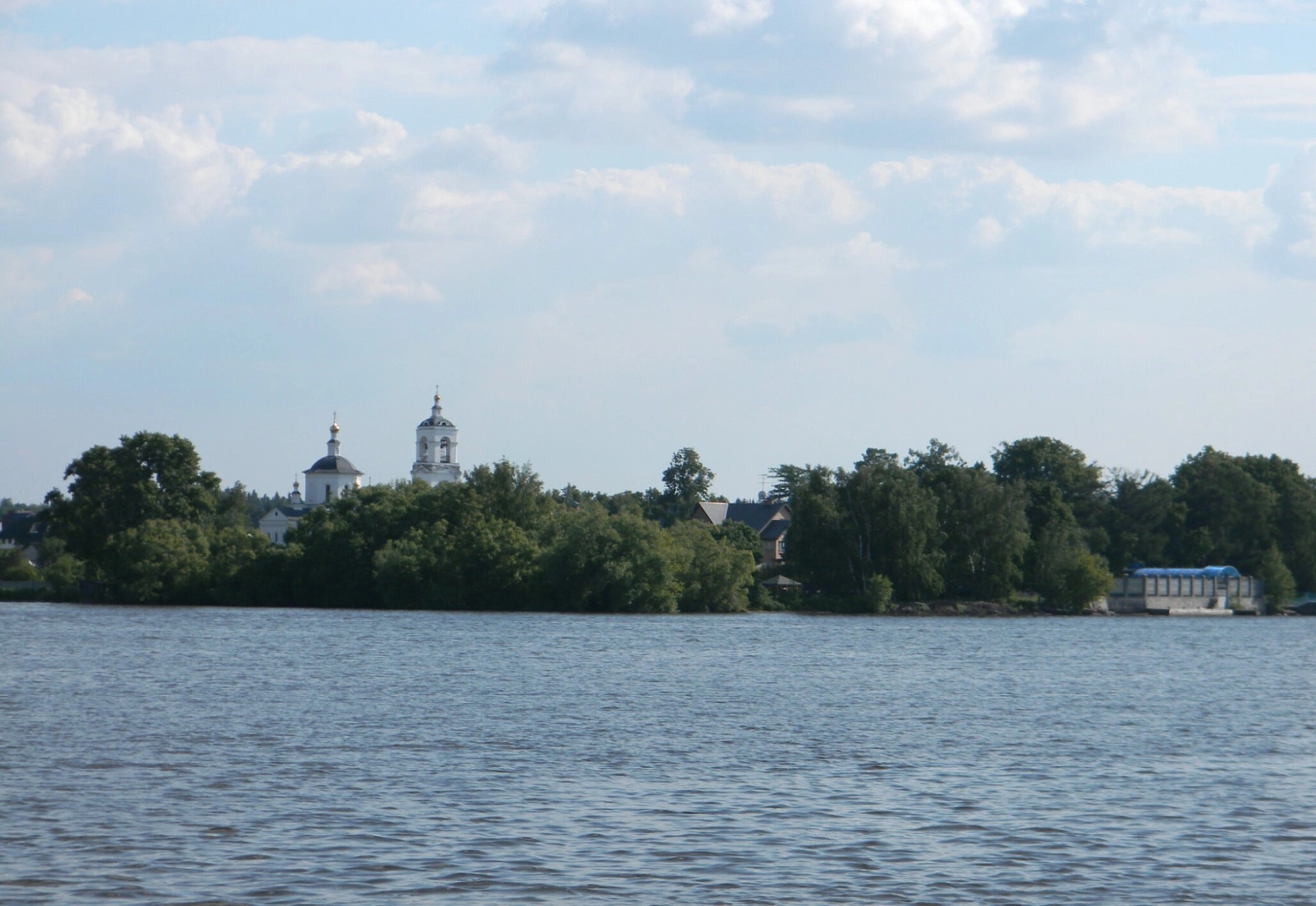На представленной фотографии запечатлена Церковь Николая Чудотворца, расположенная в живописном селе Федоскино на берегу Клязьминского водохранилища. Снимок выполнен с водной глади, что позволяет оценить величественный облик храма в его естественном природном окружении.