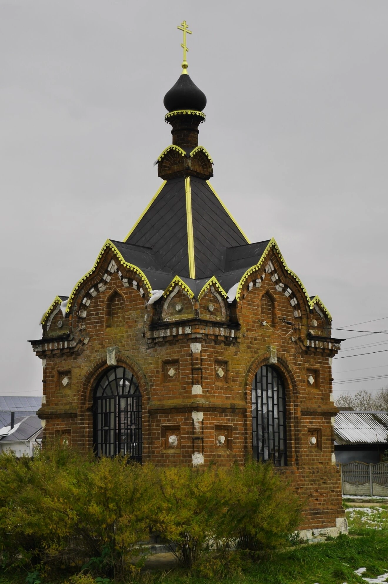 В верхней части храма видны два высоких арочных окна с тёмными решётками, обрамлённые кирпичным декором. Карниз крыши и оконные проёмы украшены декоративными элементами, напоминающими кокошники, что придаёт сооружению особую благолепие и соответствие православным архитектурным канонам.