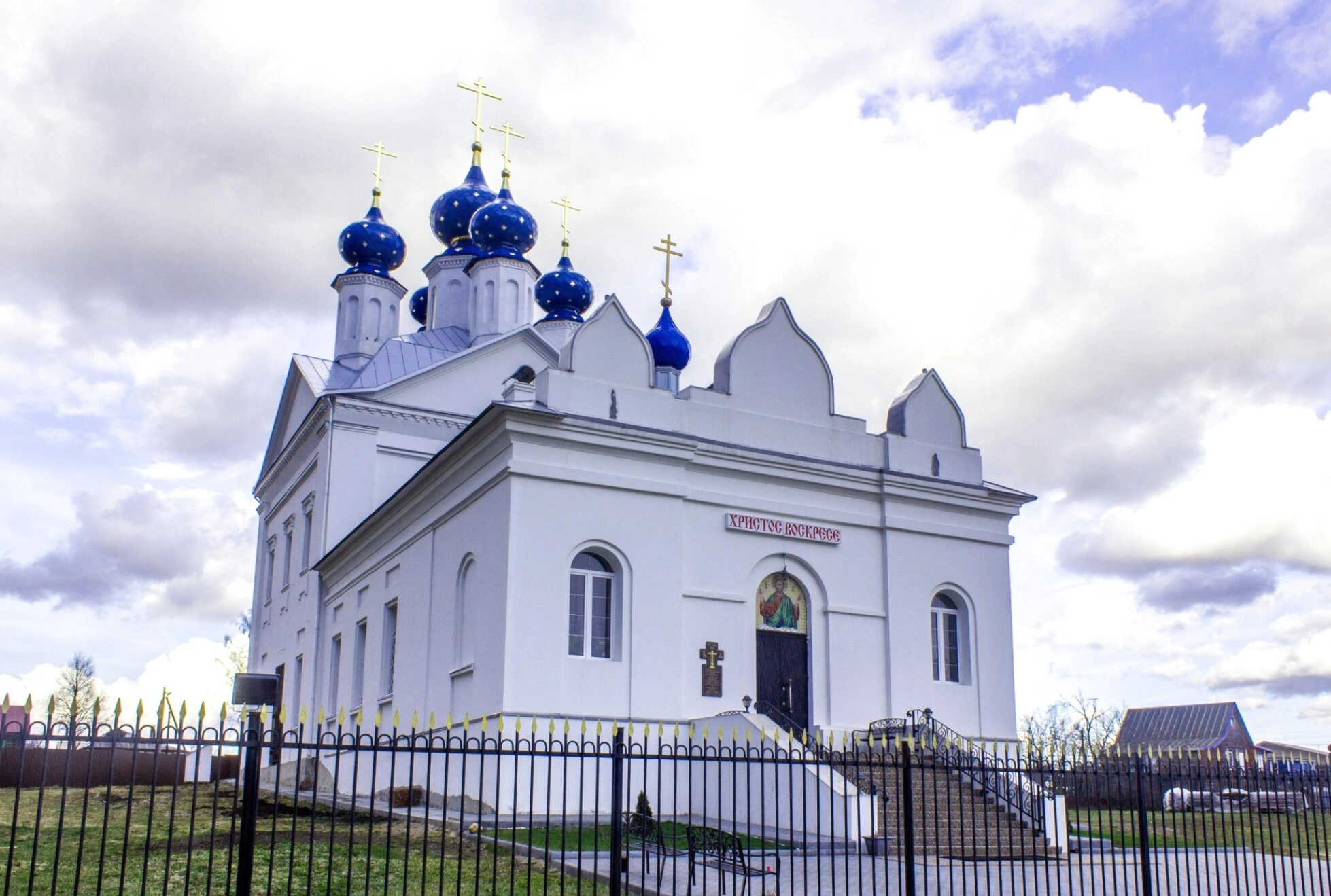 Белоснежные стены храма, увенчанные синими куполами с вознесёнными к небу златоглавыми крестами, создают образ чистоты и небесной благодати. Над главным входом чётко видна радостная пасхальная надпись «ХРИСТОС ВОСКРЕСЕ», свидетельствующая о победе жизни над смертью и напоминающая каждому входящему о главном дне христианского календаря.