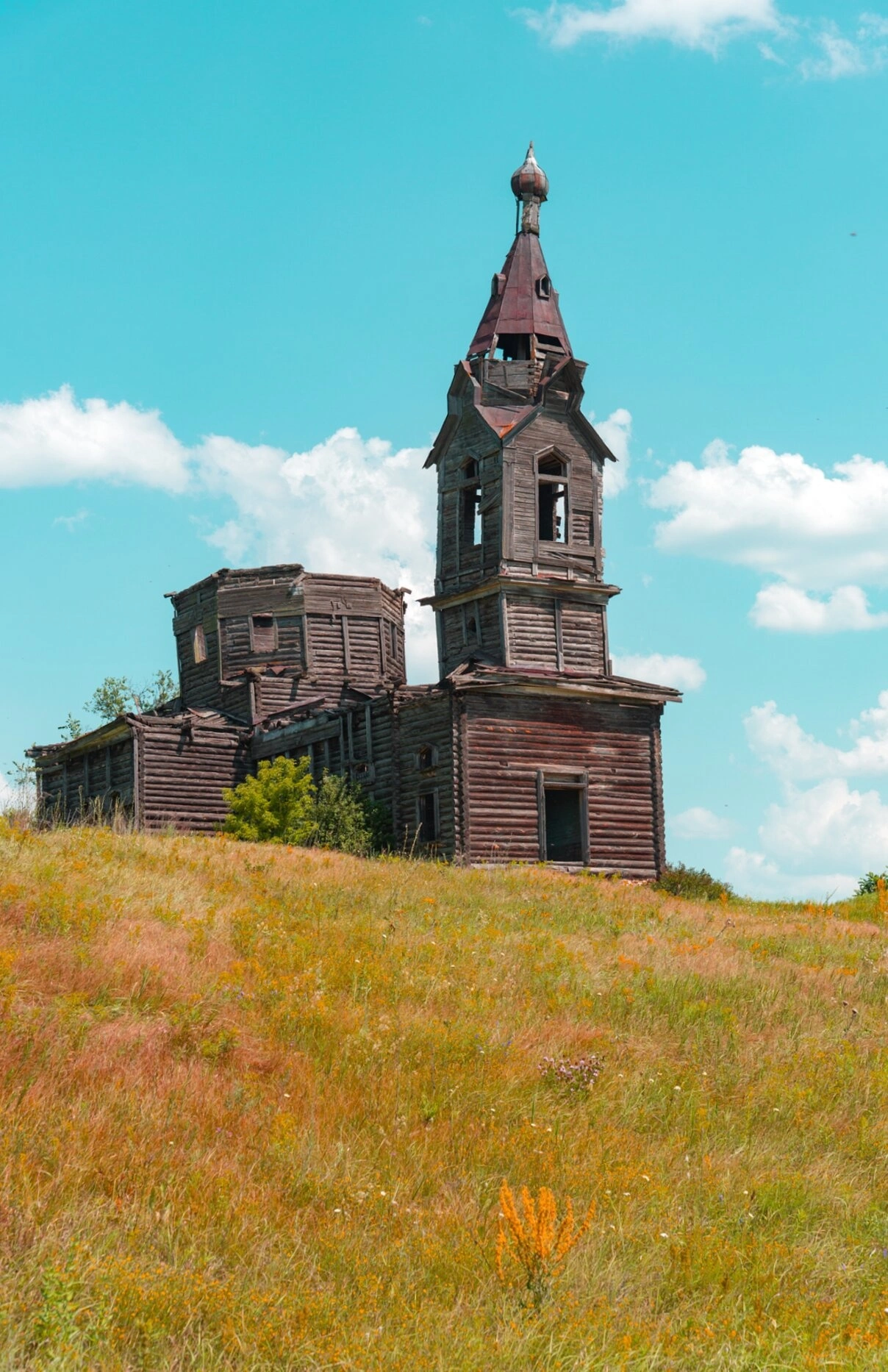 На представленной фотографии запечатлена заброшенная Церковь Николая Чудотворца, расположенная в селе Старая Ерыкла Теренгульского района Ульяновской области. Храм возвышается на живописном холме, покрытом луговой растительностью, под светлым небом с кучевыми облаками.