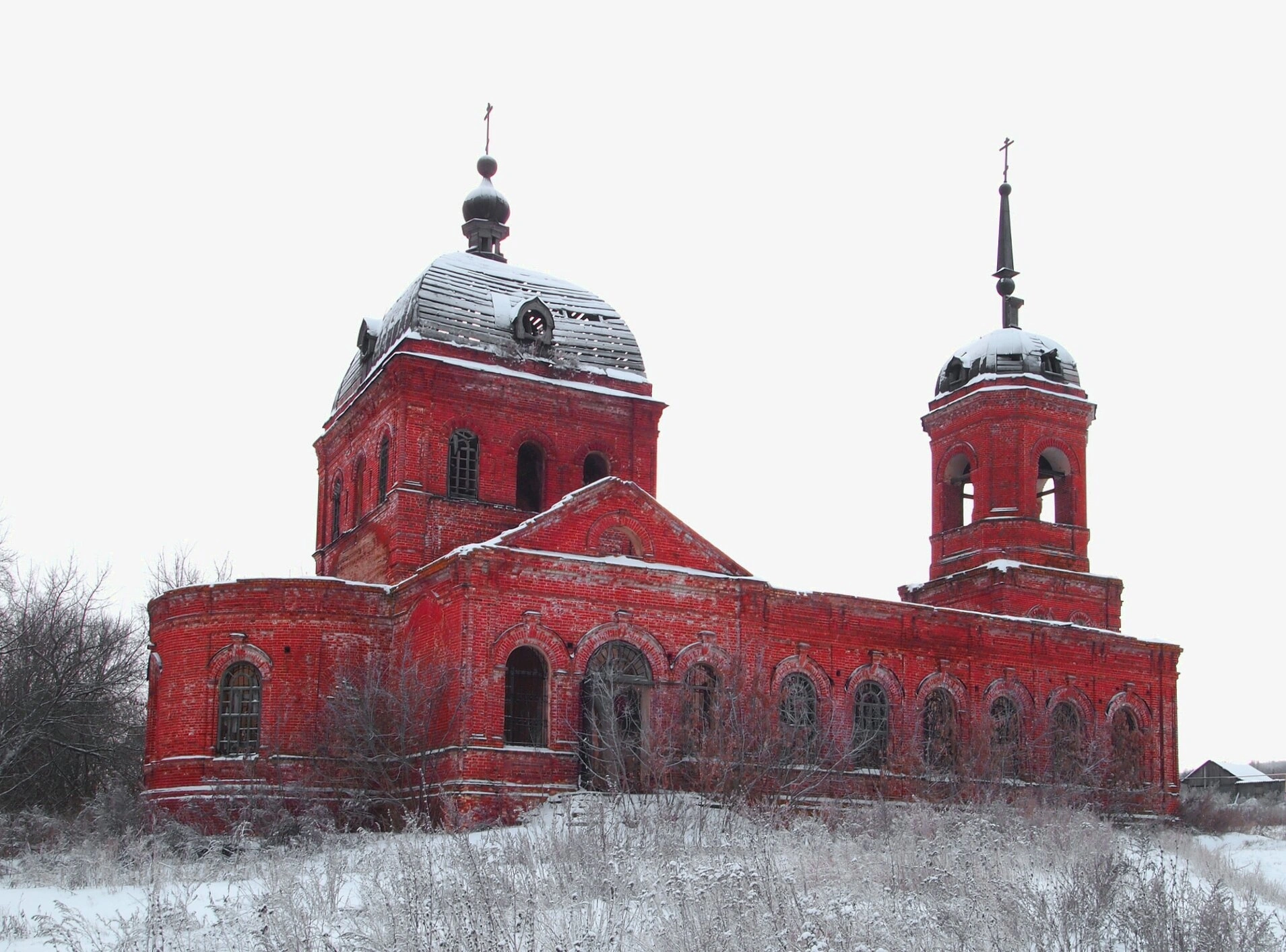 Храм окружён заснеженной травой и кустарниками, на заднем плане видны голые деревья и небольшие постройки. В кадре отсутствуют люди крупным планом, что усиливает ощущение заброшенности и тишины. Фотография передаёт атмосферу величия этой православной святыни, сохранившейся despite тяжёлых исторических испытаний.