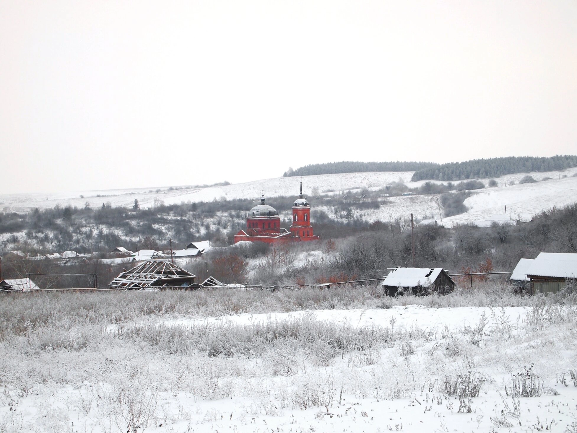 На представленной фотографии запечатлён зимний вид старинного Никольского храма в селе Стригай Базарно-Карабулакского района Саратовской области. Снимок, сделанный в декабре 2016 года, передаёт атмосферу тихого морозного дня. Заснеженные поля и покрытые инеем деревья обрамляют главный объект кадра — величественное здание церкви, выстроенное из красного кирпича. Его тёмные купола и колокольня, лишённые на тот момент завершающих крестов, возвышаются над скромными сельскими постройками, напоминая о былой духовной славе этого места.
