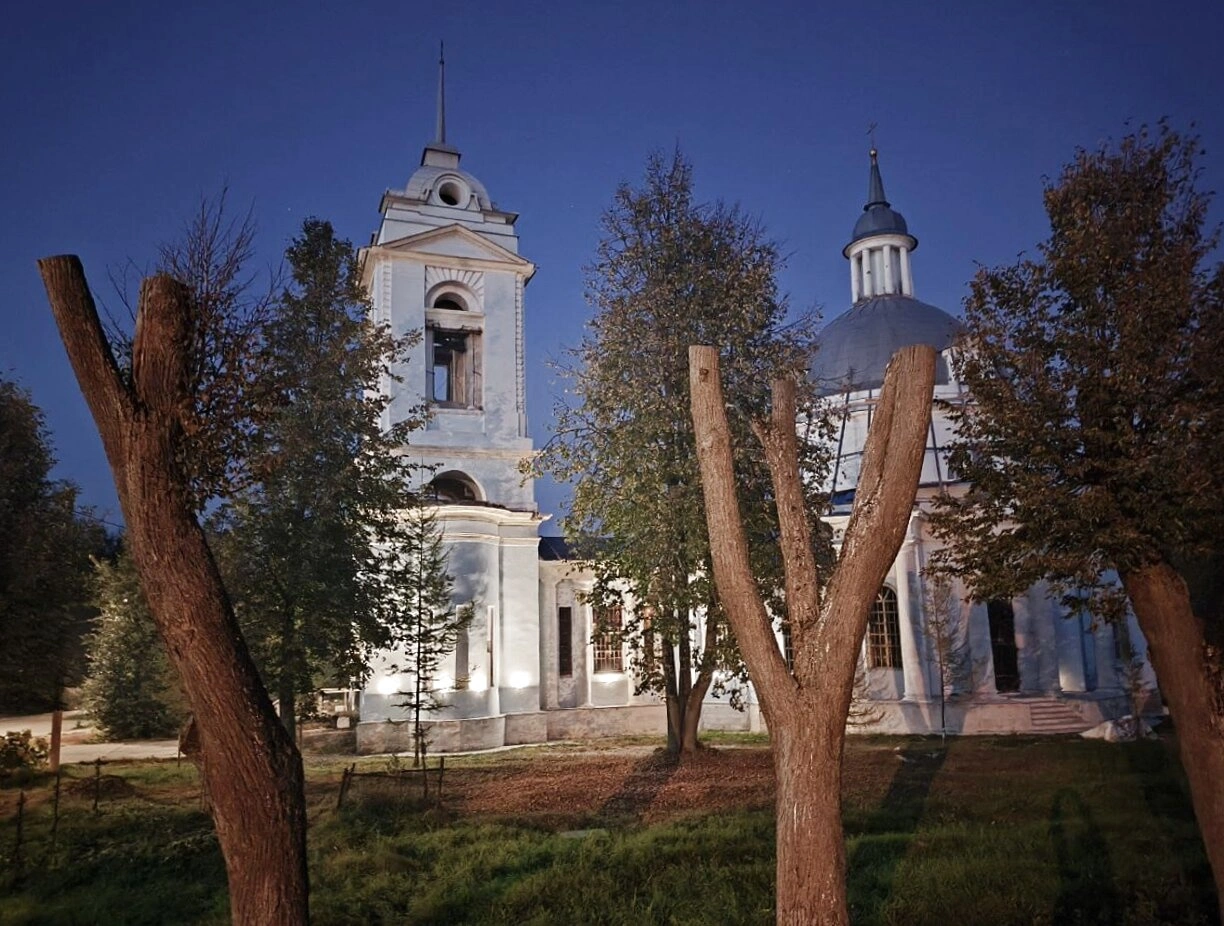 Архитектурный облик храма, отнесённого к категории объектов культурного наследия Щёлковского района, несёт в себе черты, характерные для периода барокко и классицизма. Светлые, почти белоснежные стены, арочные оконные проёмы с нарядными белыми обрамлениями, высокая многоярусная колокольня, увенчанная шпилем, и купол над основной частью здания с воздвигнутым на нём крестом — всё это создаёт целостный и благолепный образ. Искусственный свет, направленный снизу, мягко подсвечивает фасад, мастерски выделяя рельеф и детали священной постройки, что придаёт фотографии особую глубину и драматизм.