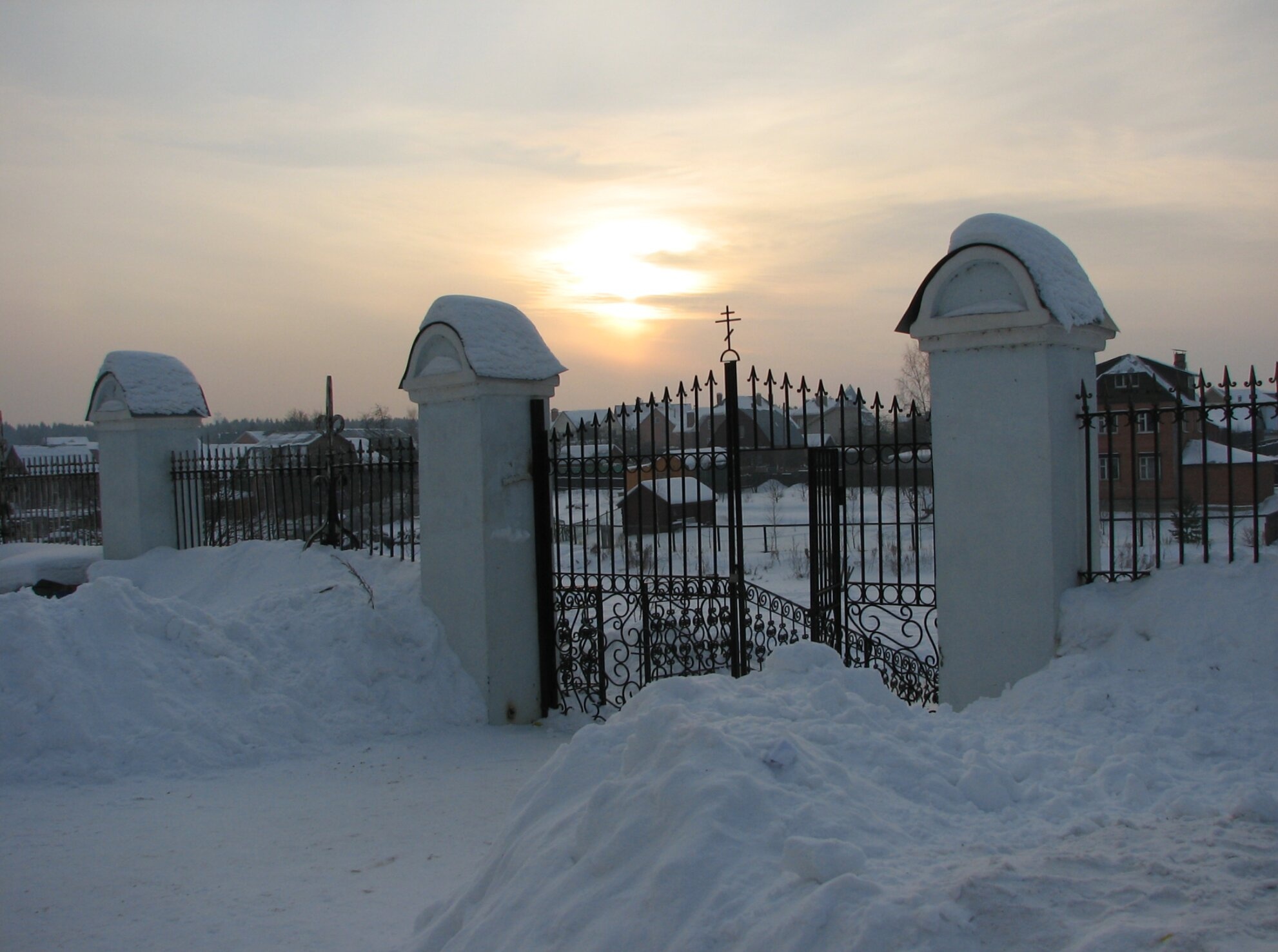 Ворота и столбы обильно покрыты свежевыпавшим снегом, вокруг лежат глубокие сугробы, создающие атмосферу умиротворения и благоговейной тишины, характерной для зимних дней в православных святынях. За оградой, на заднем плане, виднеются храмовые строения и вековые деревья, также укрытые снежным покровом.