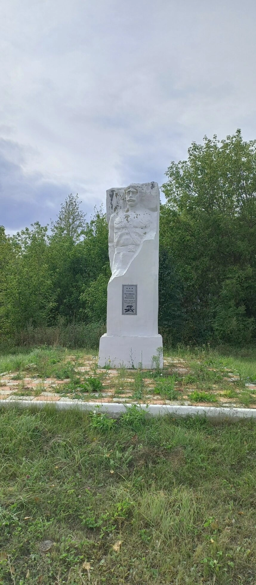 В центре кадра возвышается белокаменный монумент прямоугольной формы. Поверхность его носит следы времени: краска местами осыпалась, обнажив каменную основу, видны глубокие трещины. В верхней части угадываются остатки рельефного изображения, ныне сильно пострадавшего от непогоды и запустения. На лицевой стороне закреплена небольшая тёмная табличка, текст на которой, к сожалению, уже не различим для зрителя.