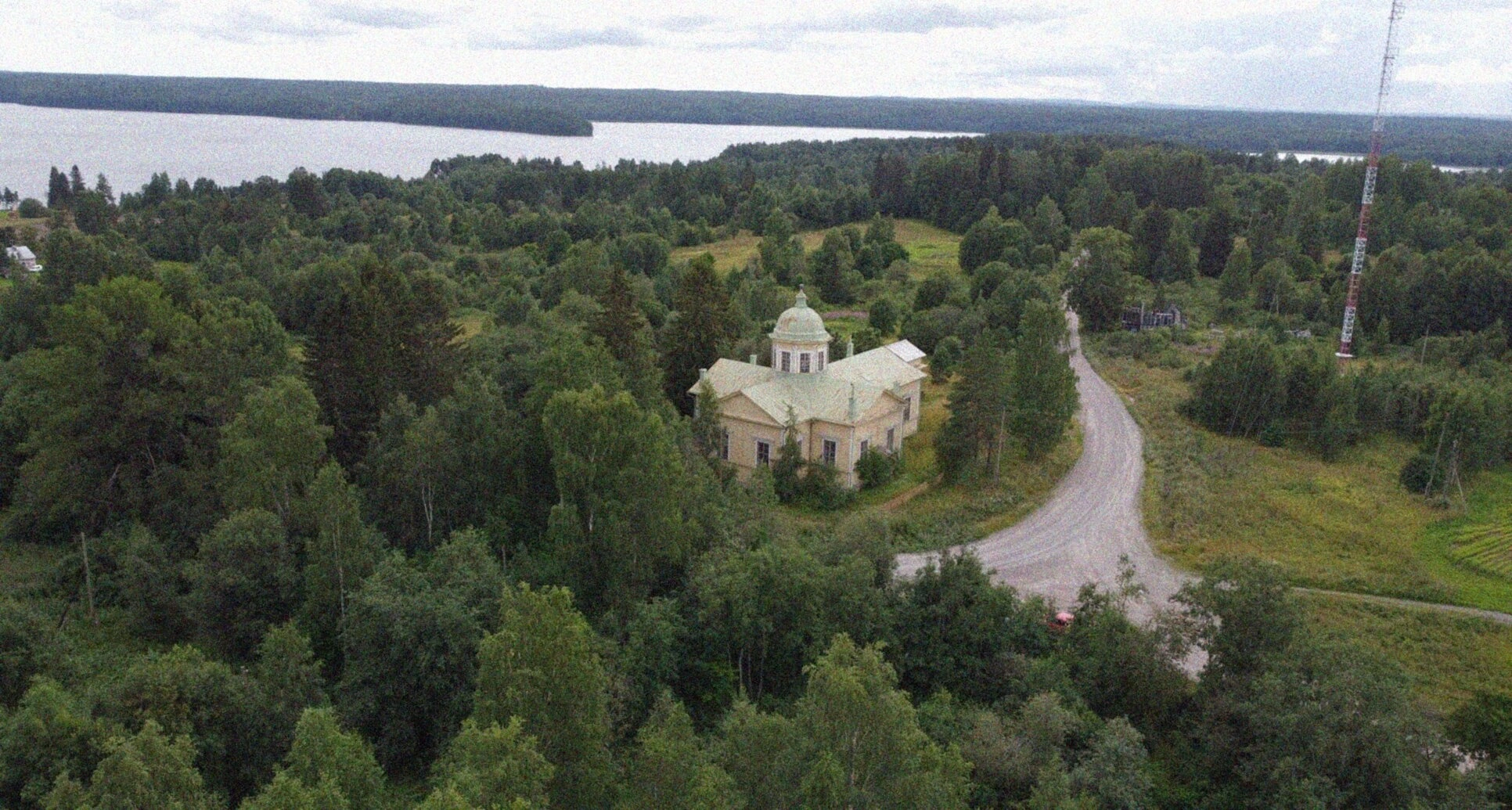 На снимке, сделанном с высоты, светлое здание храма с выразительным куполом предстаёт в гармонии с окружающей природой. Церковь окружена густой зеленью, а на заднем плане видна гладь озера. Рядом проходит грунтовая дорога, а на горизонте различима мачта связи. Общий вид передаёт умиротворённую и благодатную атмосферу этого святого места, удалённого от шумных городов и сохранившего свой первозданный дух.
