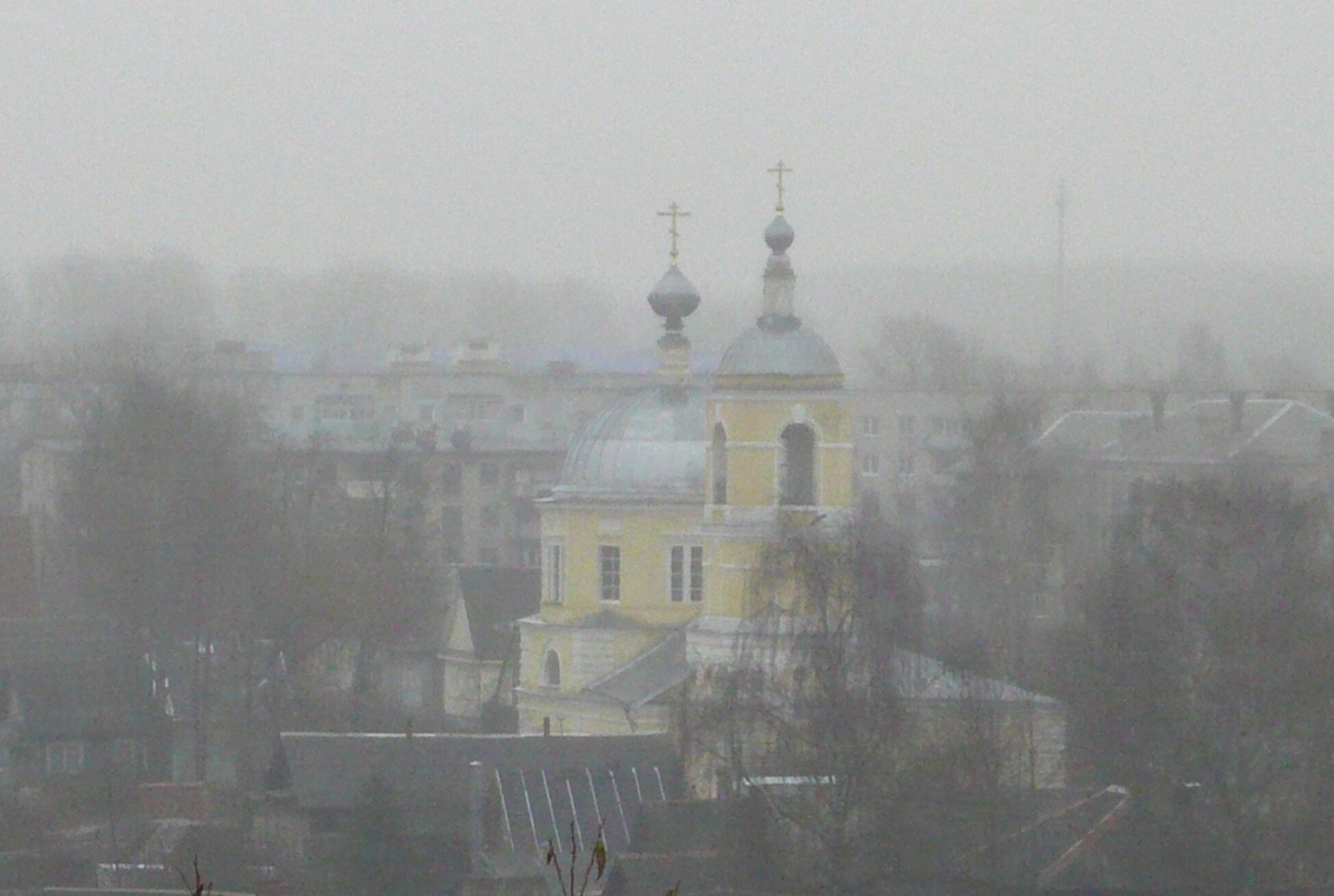 На представленной фотографии запечатлён величественный образ Церкви Николая Чудотворца, что располагается в древнем городе Торжке Тверской области. Снимок сделан в атмосферную погоду, когда густой туман окутывает город, придавая небесному храму особую, таинственную и благоговейную атмосферу. Сквозь пелену влажной дымки проступают очертания светлого жёлтого фасада с белоснежными архитектурными деталями, что символизирует свечение духовного света во тьме мира.
