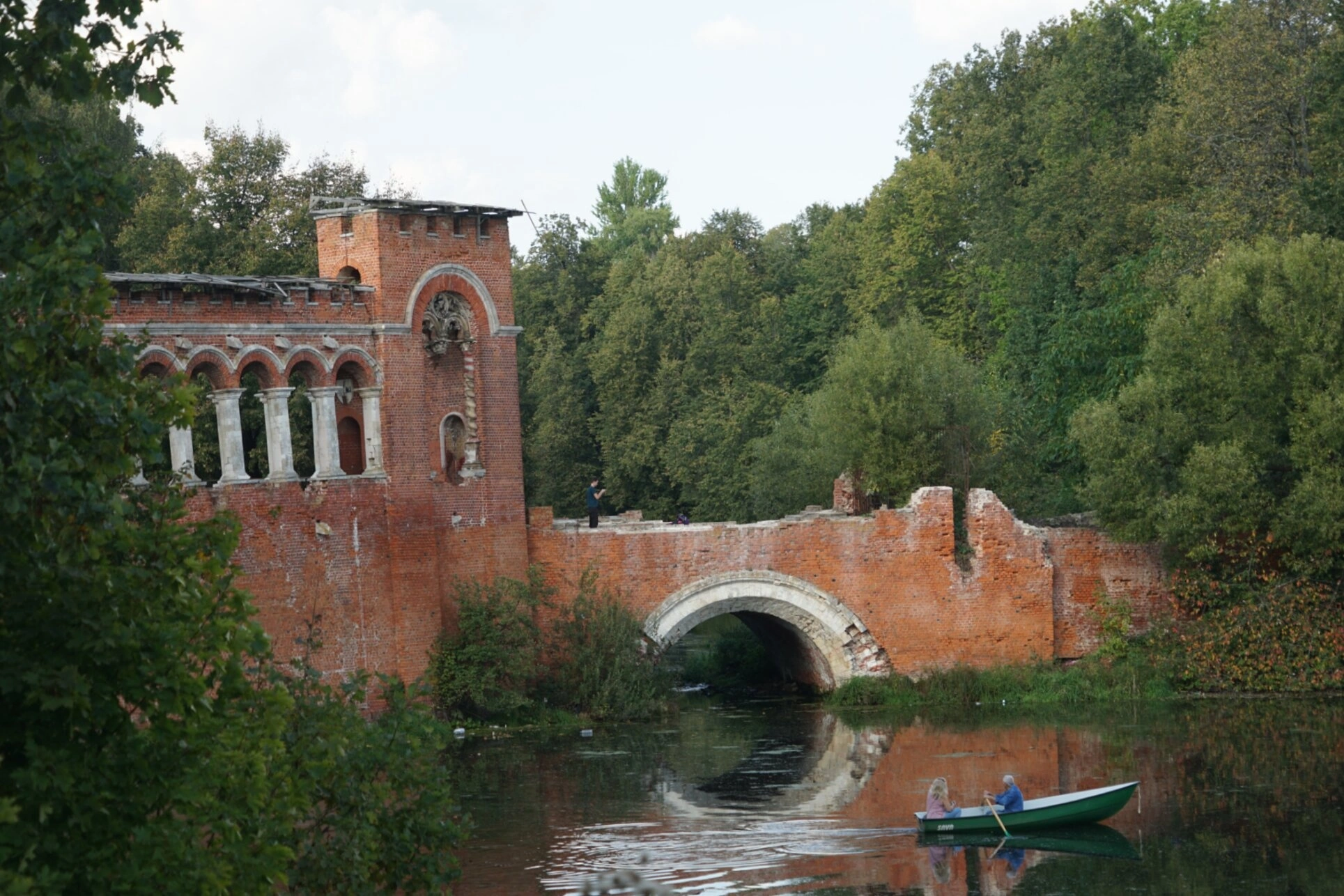 На представленной фотографии запечатлён живописный вид на псевдоготическую церковь святителя Николая Чудотворца, расположенную в ансамбле усадьбы Марфино Московской области. Храм возвышается на берегу пруда, отражаясь в тихой водной глади, что создаёт особую молитвенную атмосферу этого святого места.