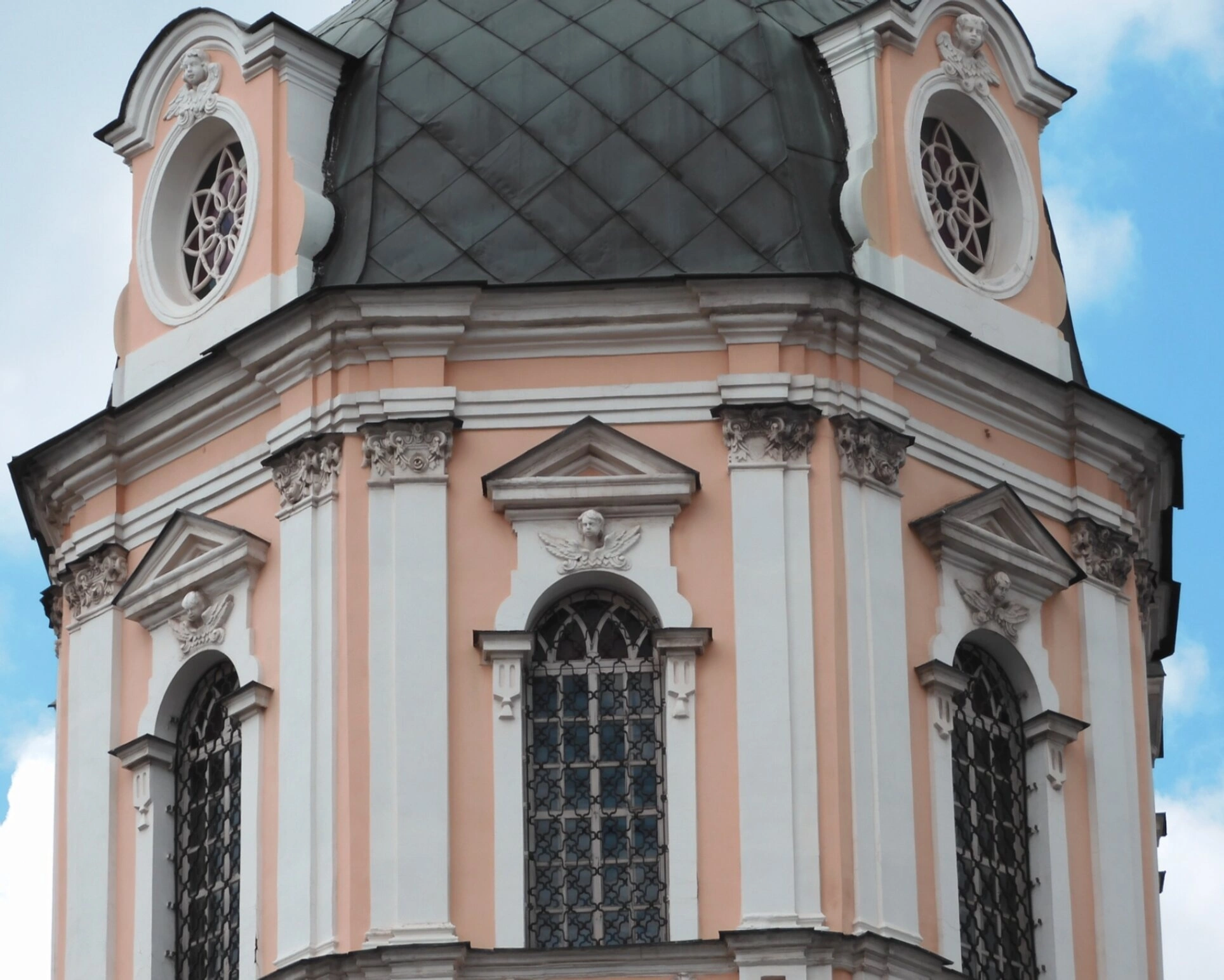 Над оконными проёмами можно наблюдать декоративные элементы в виде головок серафимов, что характерно для храмовой архитектуры барокко. Верхние окна имеют круглую форму, в то время как нижние оформлены в виде арок. Все оконные проёмы украшены коваными решётками, добавляющими фасаду особое изящество.
