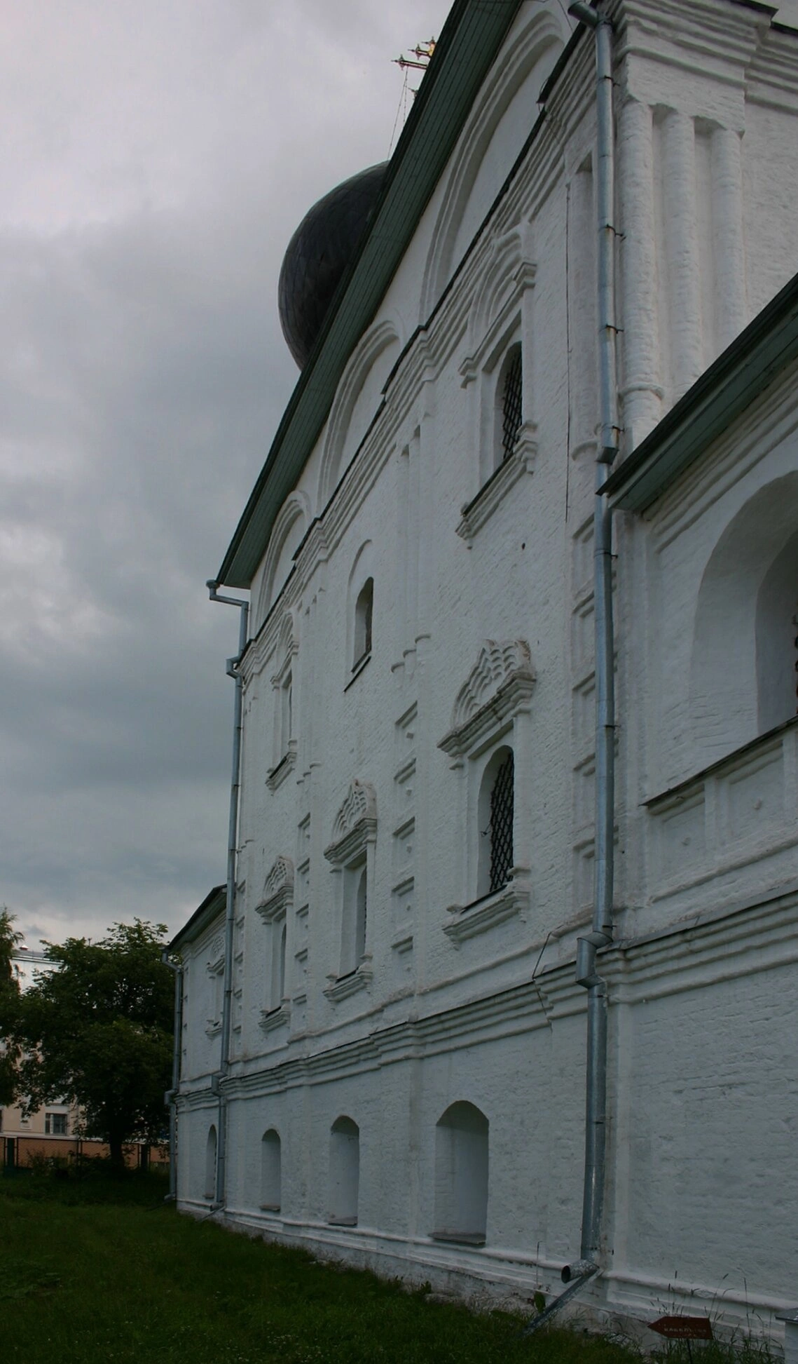 В левой части фотографии на переднем плане видна зелёная трава и кроны деревьев, что создаёт естественное природное обрамление для святыни. На заднем плане открывается пасмурное небо, характерное для северных русских земель, подчёркивающее духовную твердыню храма в окружающем ландшафте. Фрагмент тёмного купола, виднеющийся в верхней части кадра, напоминает о небесной сфере, к которой устремлена всякая душа христианская.