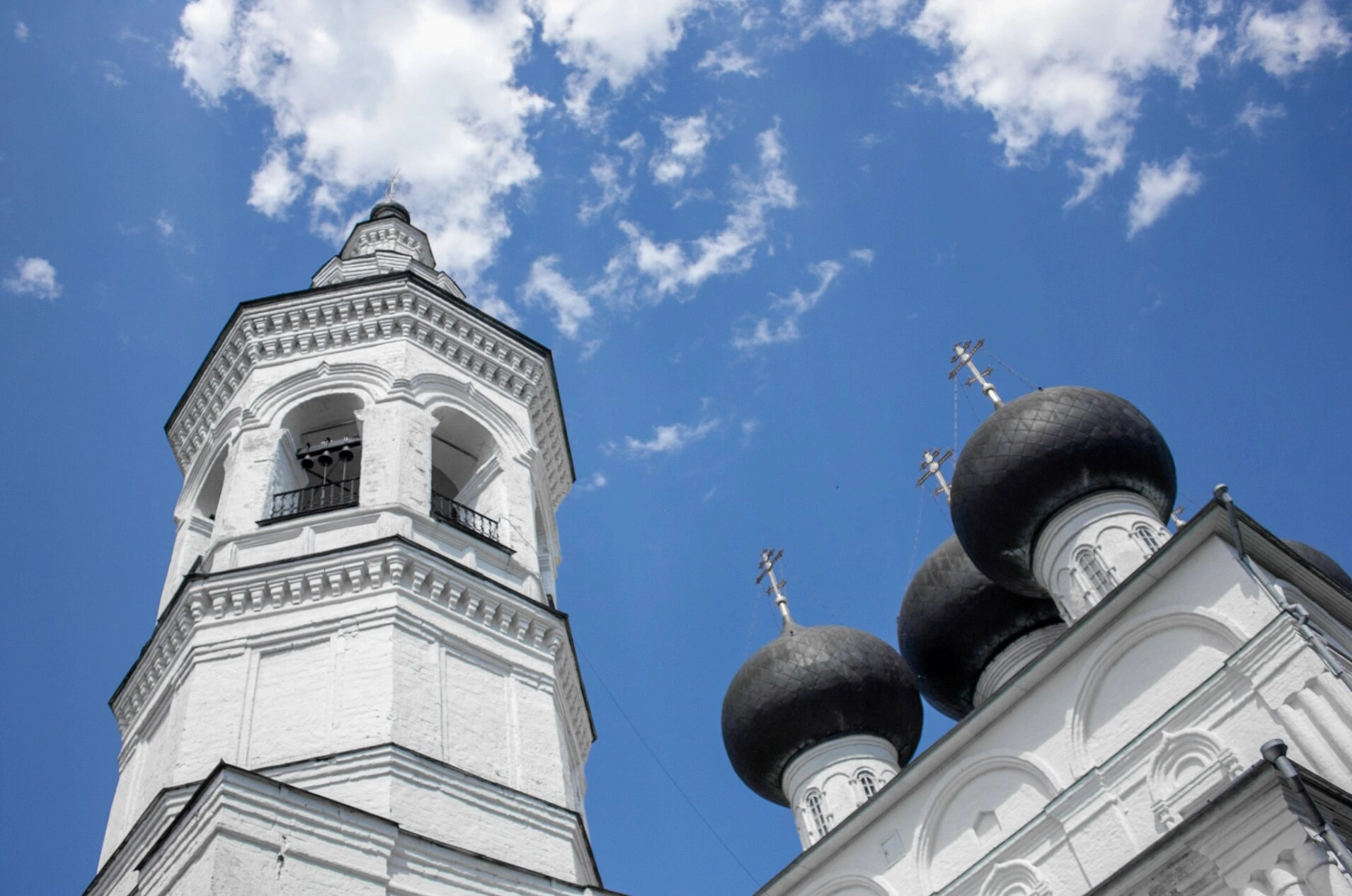 На представленной фотографии запечатлён величественный православный храм — церковь Николая Чудотворца, что расположена во Владычной слободе города Вологды. Белоснежная колокольня с шатровым завершением и тёмные купола, увенчанные золочёными крестами, создают строгий и благолепный образ, характерный для северного церковного зодчества.