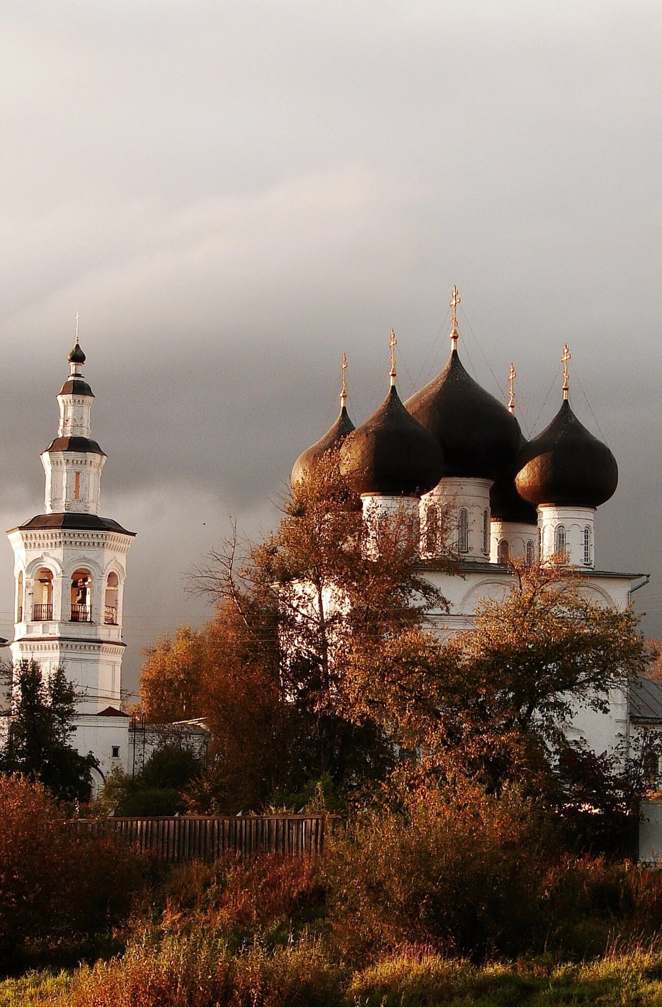 На представленной фотографии запечатлена старинная православная святыня — Церковь Николая Чудотворца, что расположена во Владычной слободе города Вологды. Храмовый комплекс, изображённый в осеннем убранстве, демонстрирует традиции русского церковного зодчества. Главный объём храма венчают чёрные луковичные главы, увенчанные златоглавыми крестами, устремлёнными в небеса. Рядом возвышается стройная шатровая колокольня белоснежного цвета, проёмы которой предназначены для церковных колоколов.