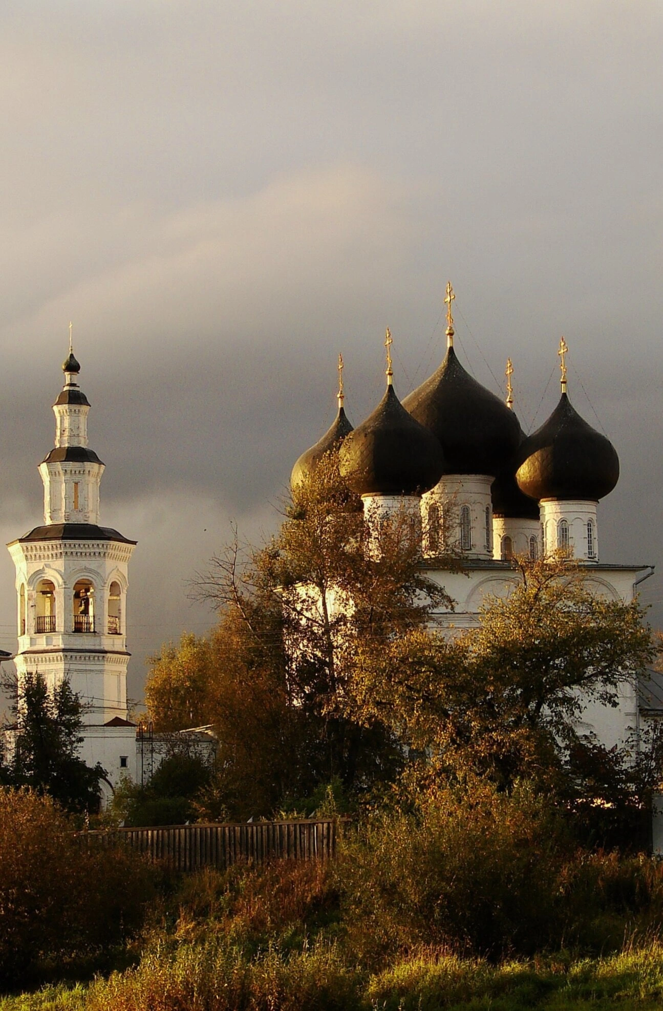 Осенняя природа дополняет благостный вид: деревья, одетые в багрянец и золото, обрамляют святыню, а тёмное небо на заднем плане подчёркивает величие архитектурного ансамбля. Фотография передаёт не только внешнюю красоту одного из старейших каменных храмов Вологды, основанного в XVII столетии, но и ту особую духовную атмосферу, которая свойственна русским православным святыням. Этот образ напоминает о непреходящих ценностях, вере и богатом историко-культурном наследии Вологодской земли.