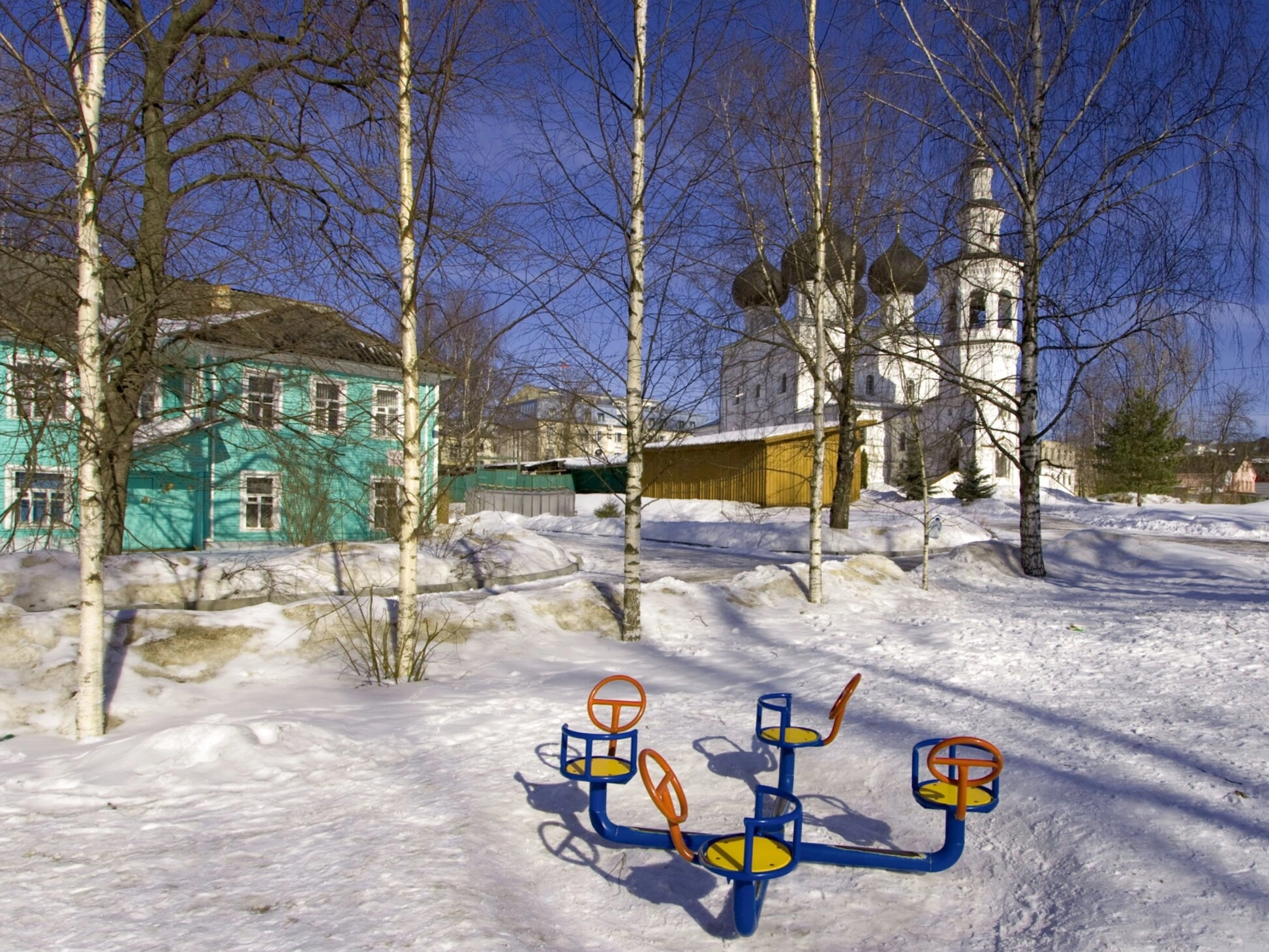 На переднем плане, символизируя продолжение жизни и детскую радость даже в суровую зимнюю пору, застыла яркая детская карусель. Её синие и красные элементы добавляют в монументальный пейзаж яркий и жизнеутверждающий акцент. За ней виднеются стройные берёзы, их ветви, лишённые листвы, устремлены ввысь, подобно молитве.