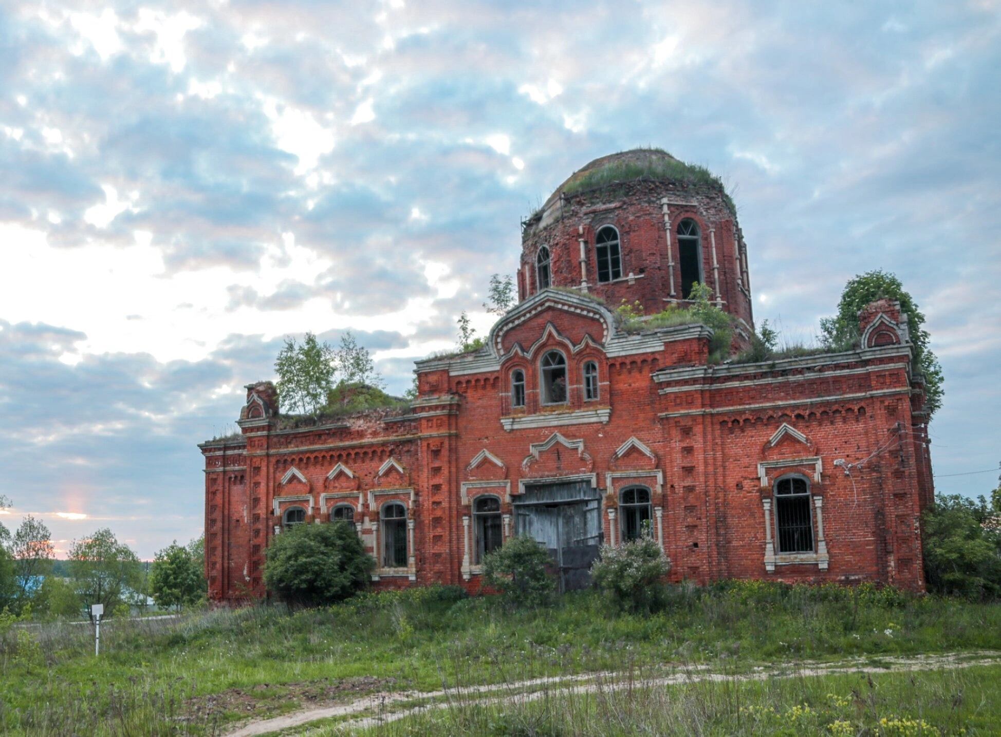 На представленной фотографии запечатлена полуразрушенная Церковь Николы Чудотворца, расположенная в селе Иваньково Ясногорского района Тульской области. Этот православный храм, также известный как церковь святых апостолов Петра и Павла, представляет собой значительный памятник церковной архитектуры второй половины XVIII века.