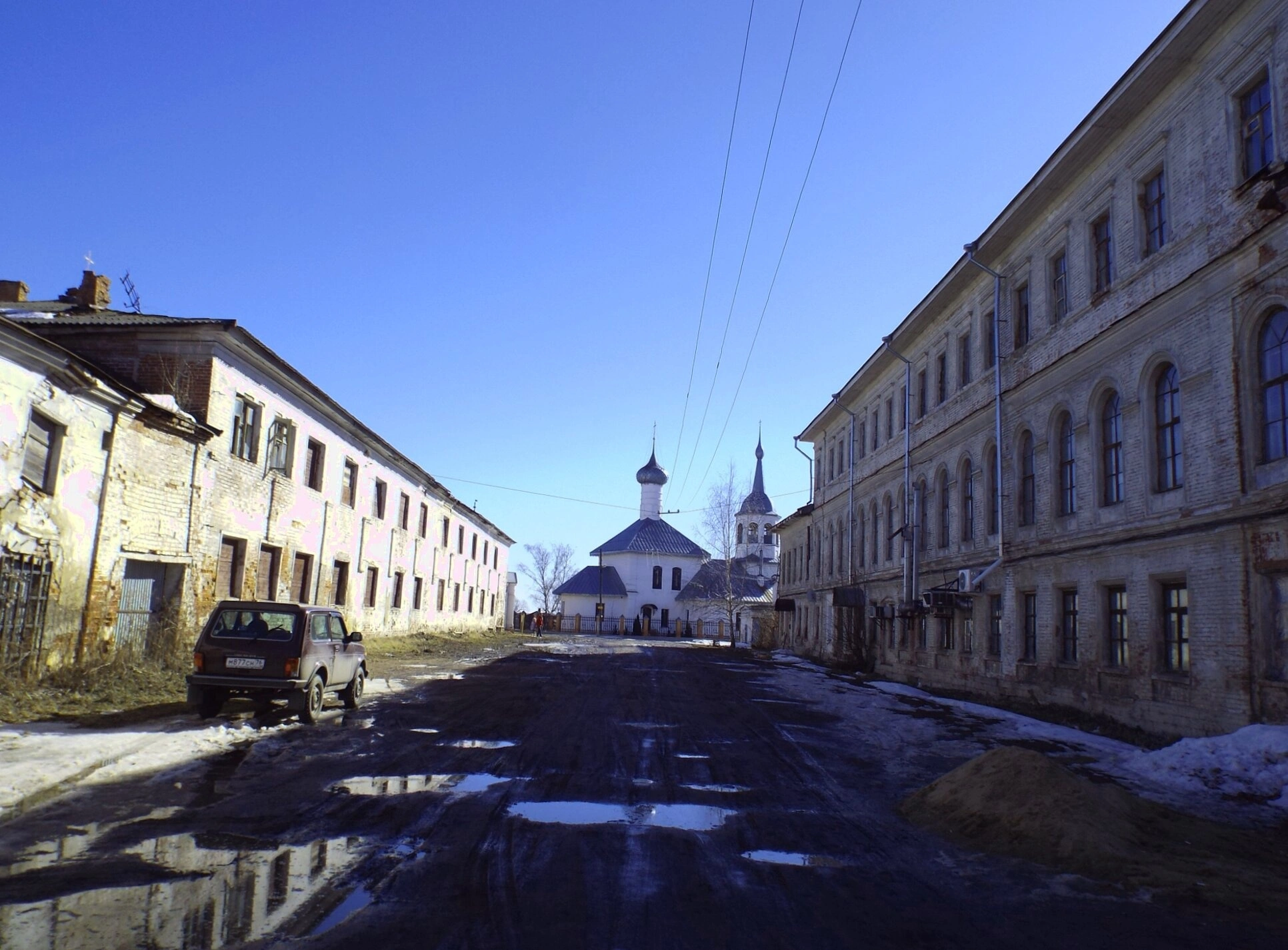 На фотографии хорошо просматривается перспектива улицы, направляющейся к святому месту. Дорога, покрытая весенней грязью и лужами, свидетельствует о межсезонье - ранней весне или поздней осени, когда снег уже частично сошёл, но земля ещё не просохла. По краям дороги видны остатки снежного покрова, создающие характерный для русского пейзажа контраст между уходящей зимой и наступающей весной.