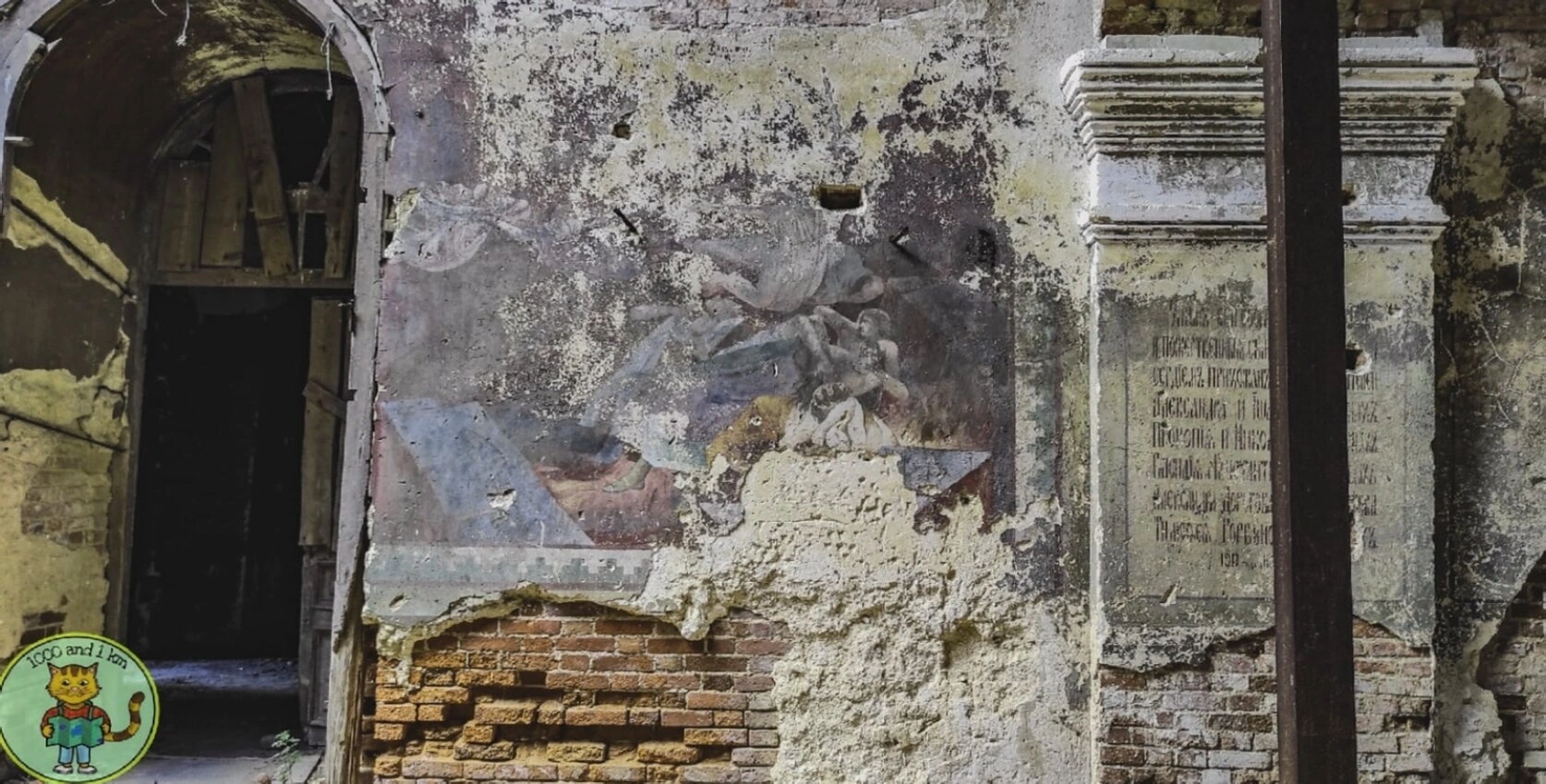 На фотографии запечатлены руины Церкви Николы (Петра и Павла), расположенной в селе Иваньково Ясногорского района. Снимок наглядно демонстрирует плачевное состояние некогда величественного православного храма, который ныне пребывает в запустении. Центральную часть композиции занимает фрагмент стены с уцелевшими остатками фресковой росписи. Эти священные изображения, на которых когда-то были запечатлены религиозные сцены или лики святых, ныне сильно повреждены: краски потускнели и выцвели, а штукатурный слой осыпался, унося с собой частицы духовного и художественного наследия.