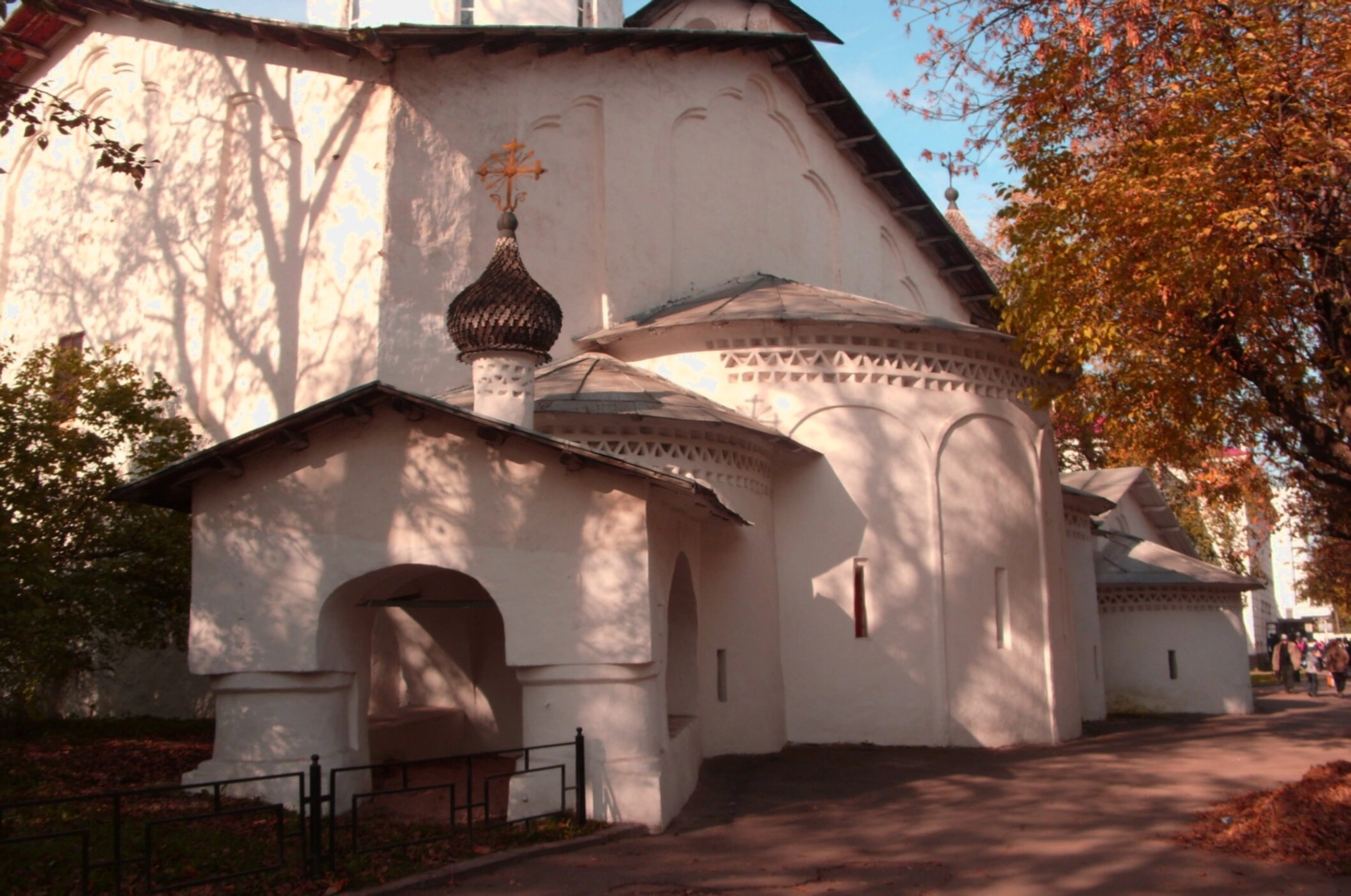 Фасад здания оживляют арочные проёмы и узкие окна-бойницы, напоминающие о суровых временах, когда храм был не только домом молитвы, но и крепостью. Осенняя пора, в которую был сделан снимок, добавляет пейзажу особое настроение: золотистая листва деревьев, окружающих церковь, создаёт яркий контраст с монументальной строгостью древней постройки.