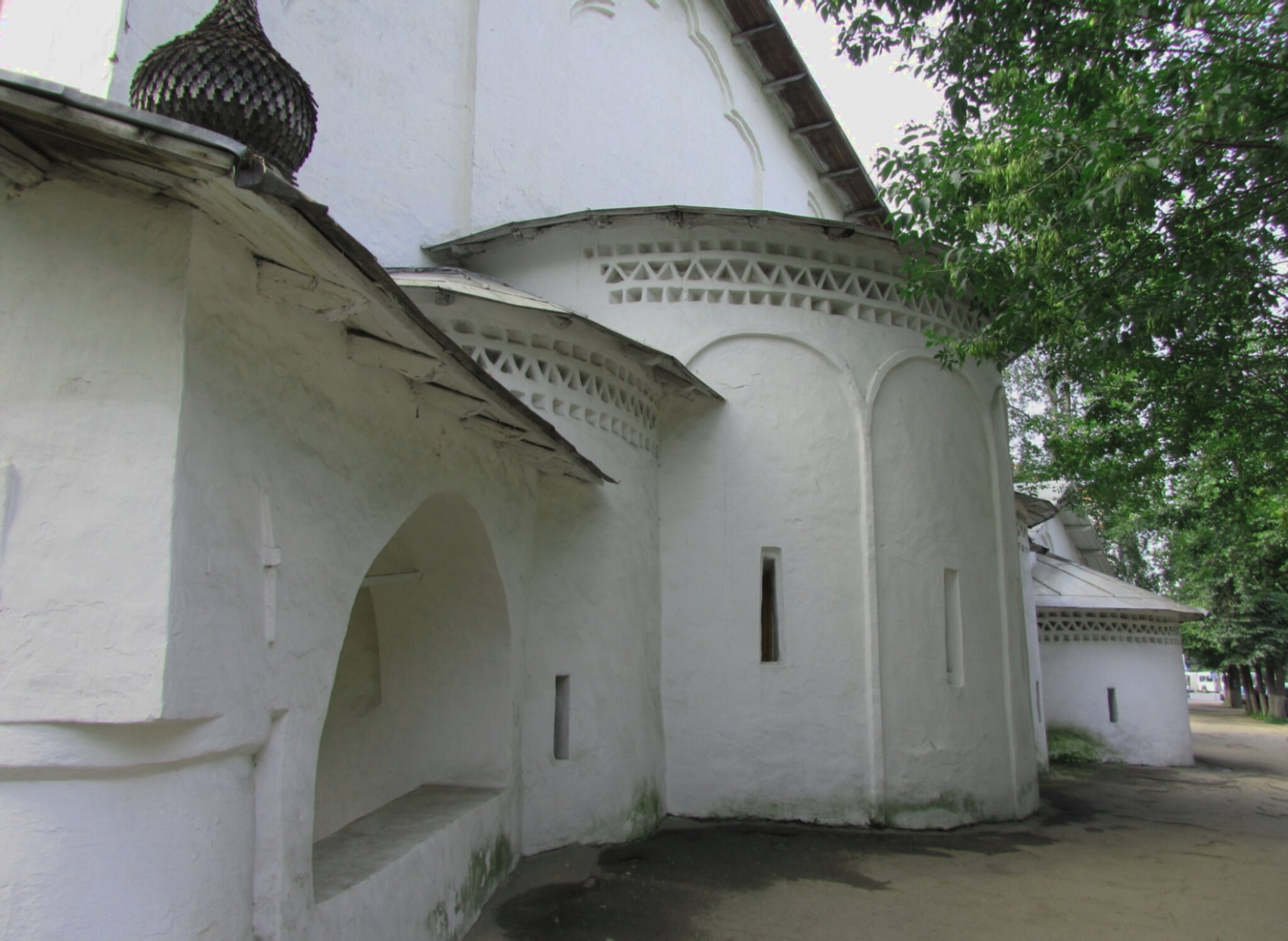 Храм располагается в историческом центре Пскова, на месте, которое в старину именовалось «Усохой», означавшим высохшее, возвышенное место у болота. Фотография позволяет рассмотреть характерные черты псковской архитектурной традиции: мощные белоснежные стены, строгие и лаконичные формы, восьмискатное покрытие, а также изящный аркатурно-колончатый пояс, опоясывающий барабан могучей главы.