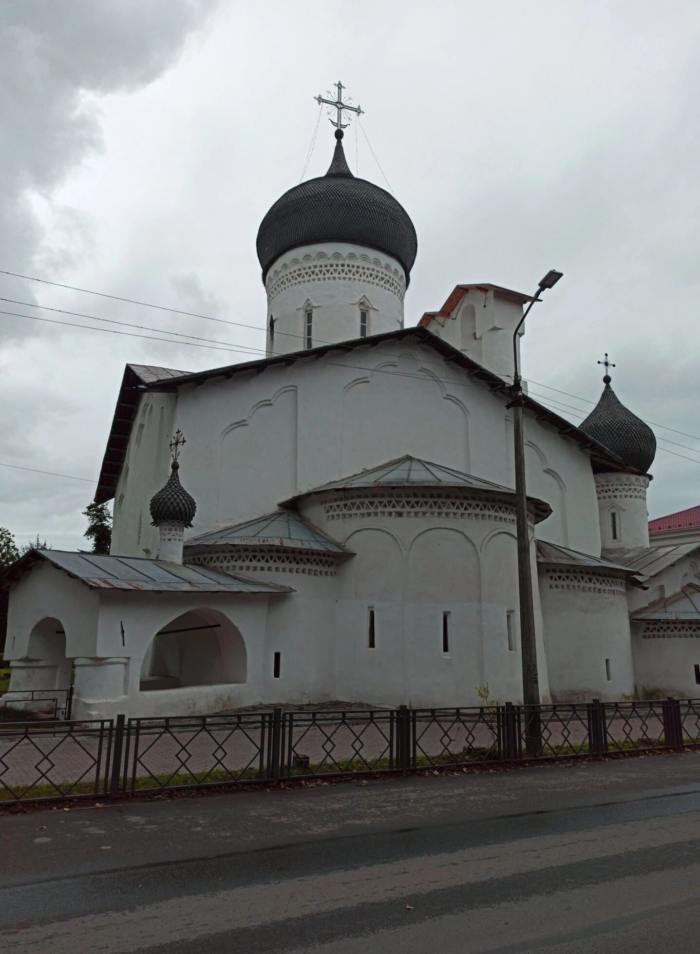 Ансамбль дополняют прилегающие пристройки и малые купола, создавая гармоничный и сложный силуэт. Ползучие арки, завершающие лопатки, имеют двух- и трехлопастное очертание, что придает постройке особую пластичность и узнаваемость. Перед святым фасадом проходит дорога, а по периметру участка установлен металлический забор. Пасмурное небо на снимке наполняет изображение атмосферой благоговения и вечности, подчеркивая древность и духовную значимость этого места.