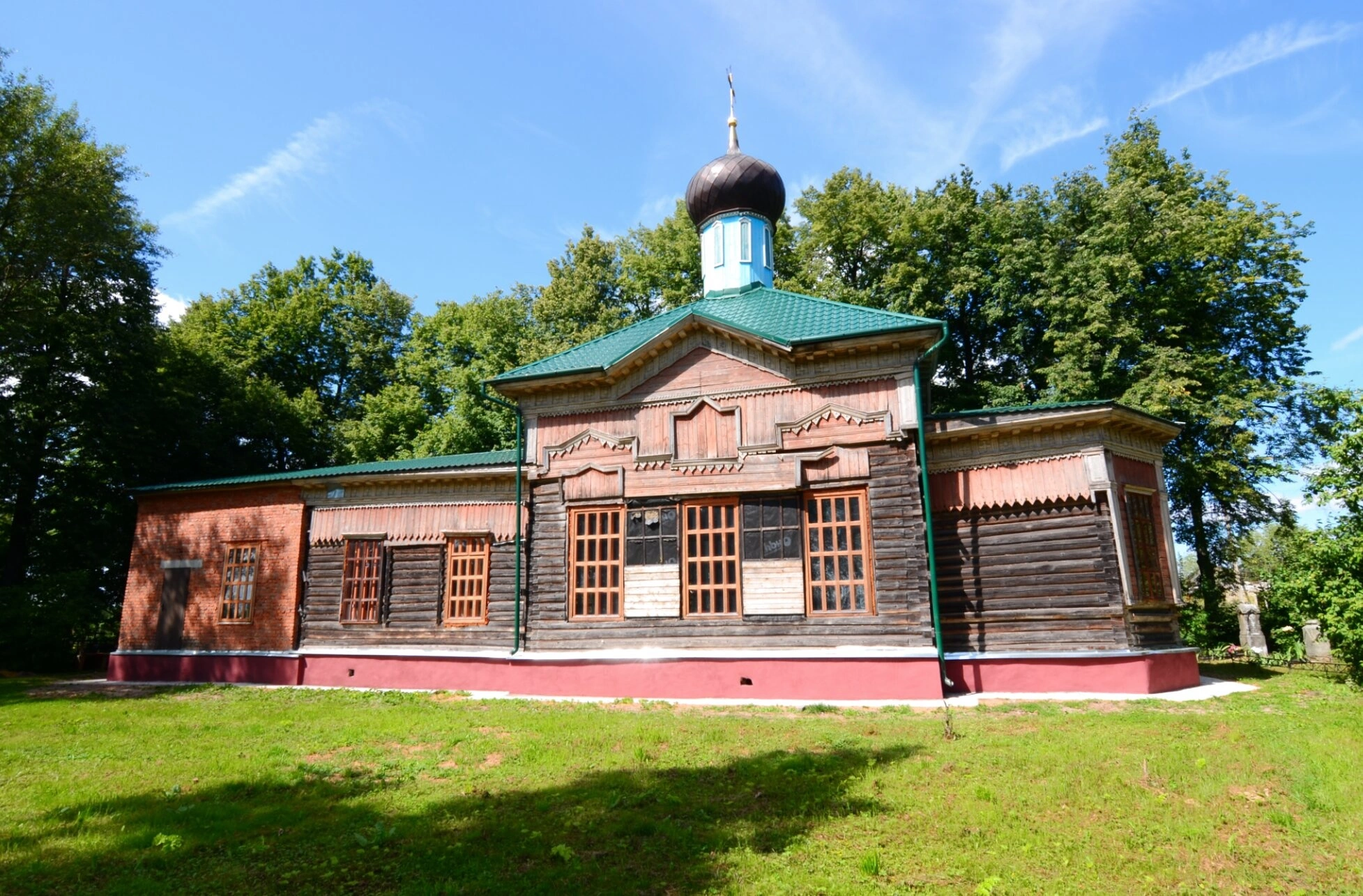 Храм венчает многоскатная крыша, покрытая материалом бирюзового оттенка, что создает гармоничный контраст с деревянными стенами. Над центральной частью здания возвышается небольшой купол, увенчанный православным крестом – символом искупительной жертвы Христа. Оконные проемы прямоугольной формы обрамлены деревянными рамами, некоторые из них дополнены ставнями, выполненными из ажурных деревянных реек.
