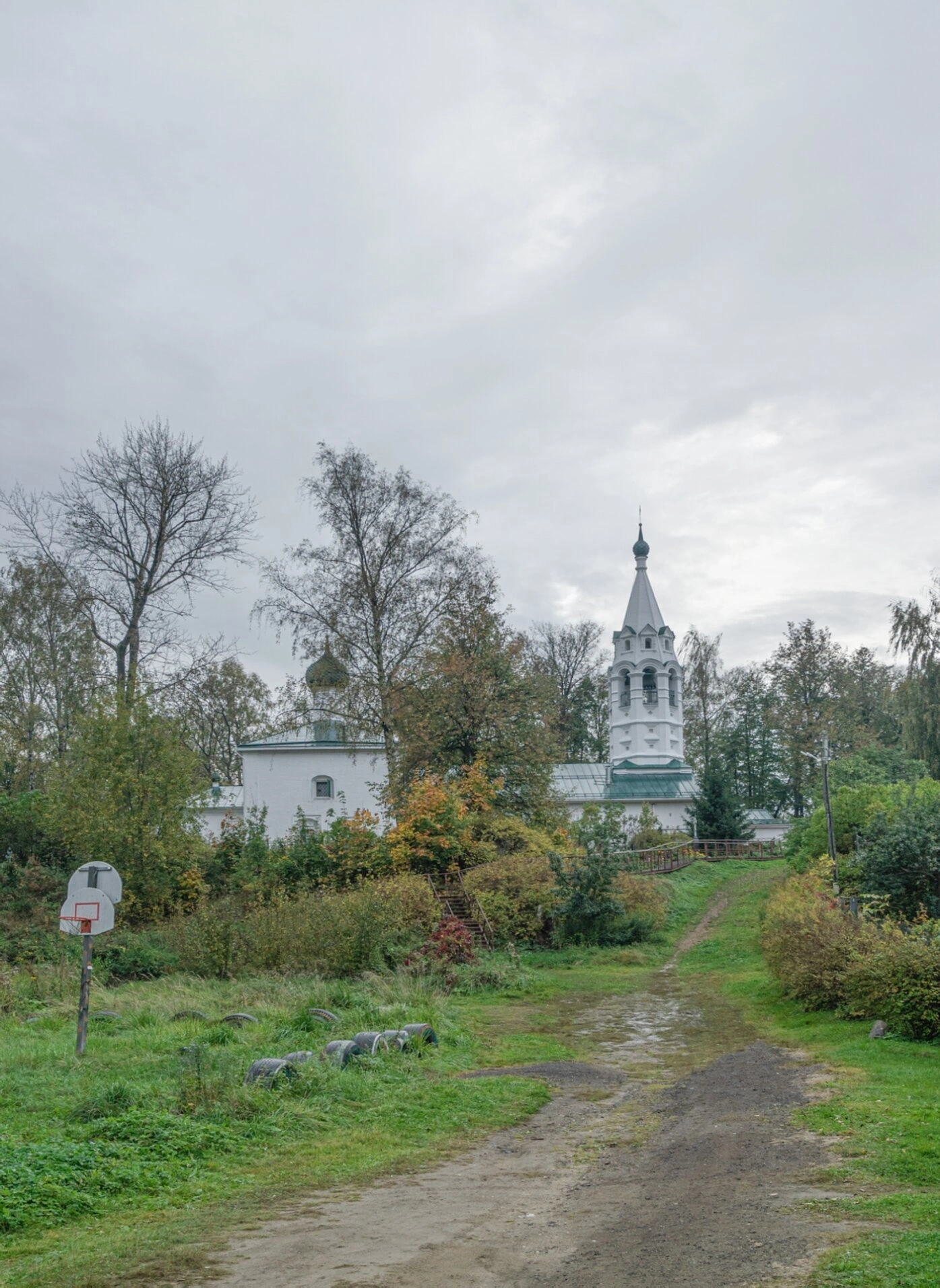 На переднем плане слева заметна стойка с баскетбольным кольцом, свидетельствующая о современной жизни этого исторического района. Пасмурное небо, покрытое слоистыми облаками, наполняет снимок особым настроением умиротворения и спокойствия, характерным для православных святынь.