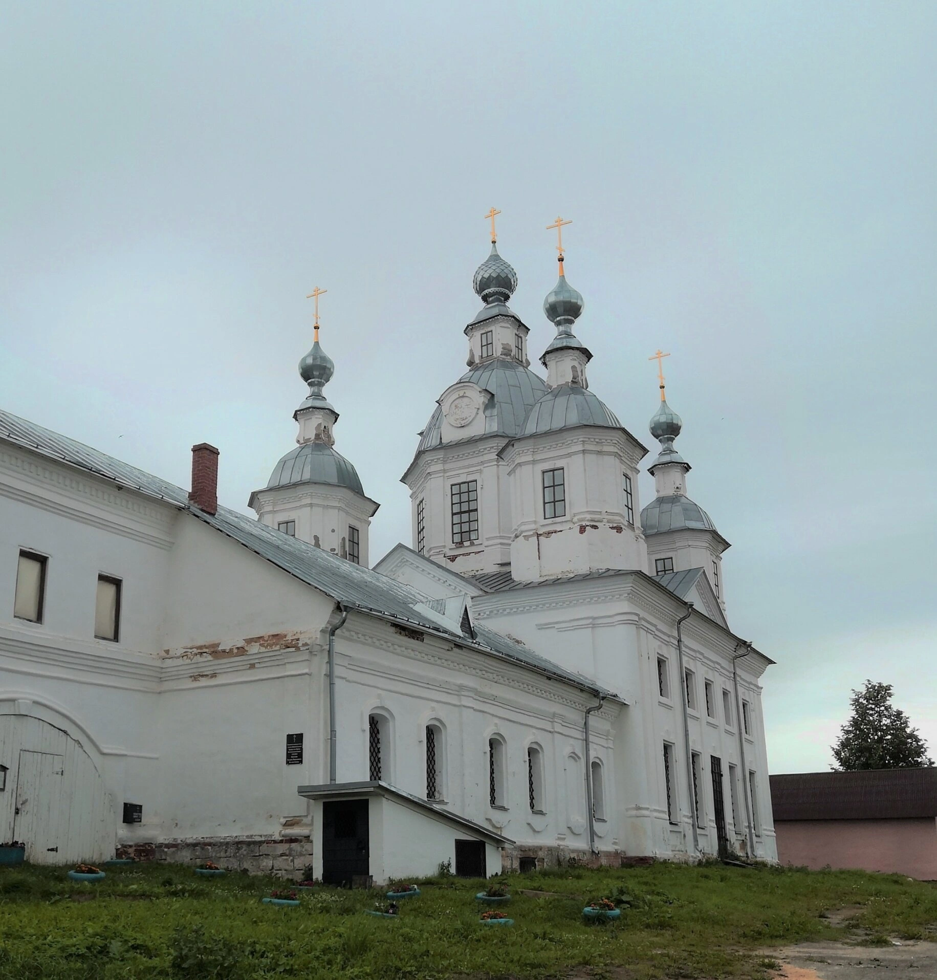 На фотографии хорошо просматриваются особенности внешнего убранства храма: строгие формы, характерные для классицизма, симметричная композиция и лаконичный декор. Золотые кресты на куполах символизируют победу жизни над смертью и направляют взгляд в небесную высь. Окружающий пейзаж с зелёной травой и деревьями подчёркивает уединённость и духовную значимость этого места.