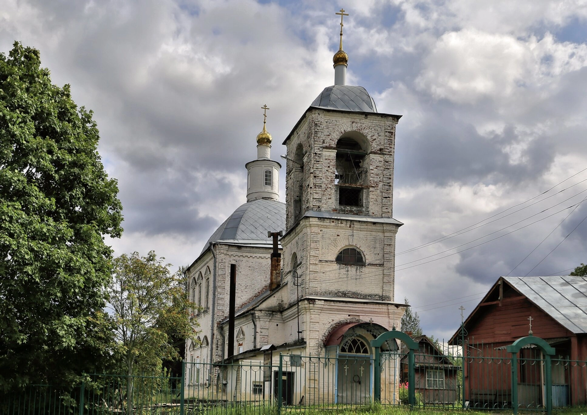 На снимке отчетливо видны следы времени на стенах святой обители - местами наблюдается осыпание штукатурки, что свидетельствует о необходимости проведения реставрационных работ. С левой стороны от храма растет величественное дерево с пышной кроной, а с правой стороны расположен деревянный дом, традиционно характерный для русских селений. Перед церковной оградой установлен металлический забор, на переднем плане изображена зеленая травяная растительность. Небесный свод покрыт облаками, создающими особое настроение благости и умиротворения.