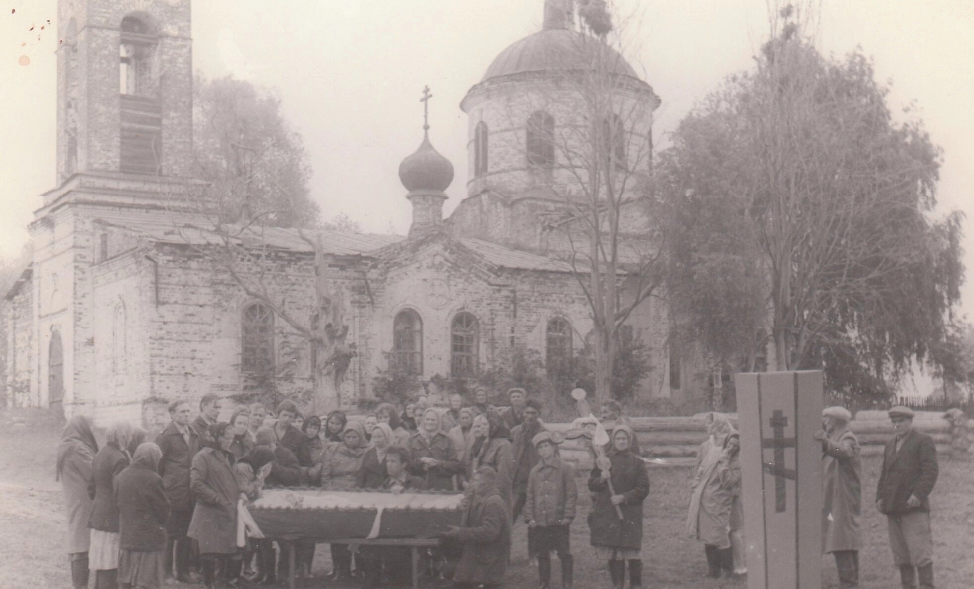 На исторической фотографии запечатлена Церковь Параскевы Пятницы, расположенная в селе Невадьево Вачского района Нижегородской области. Снимок передаёт solemnную атмосферу момента, связанного с церковным обрядом. На переднем плане видна группа прихожан, собравшихся вокруг гроба, что свидетельствует о совершении заупокойной службы. На заднем плане возвышается само здание храма – каменная церковь с колокольней, несущая на себе следы времени.