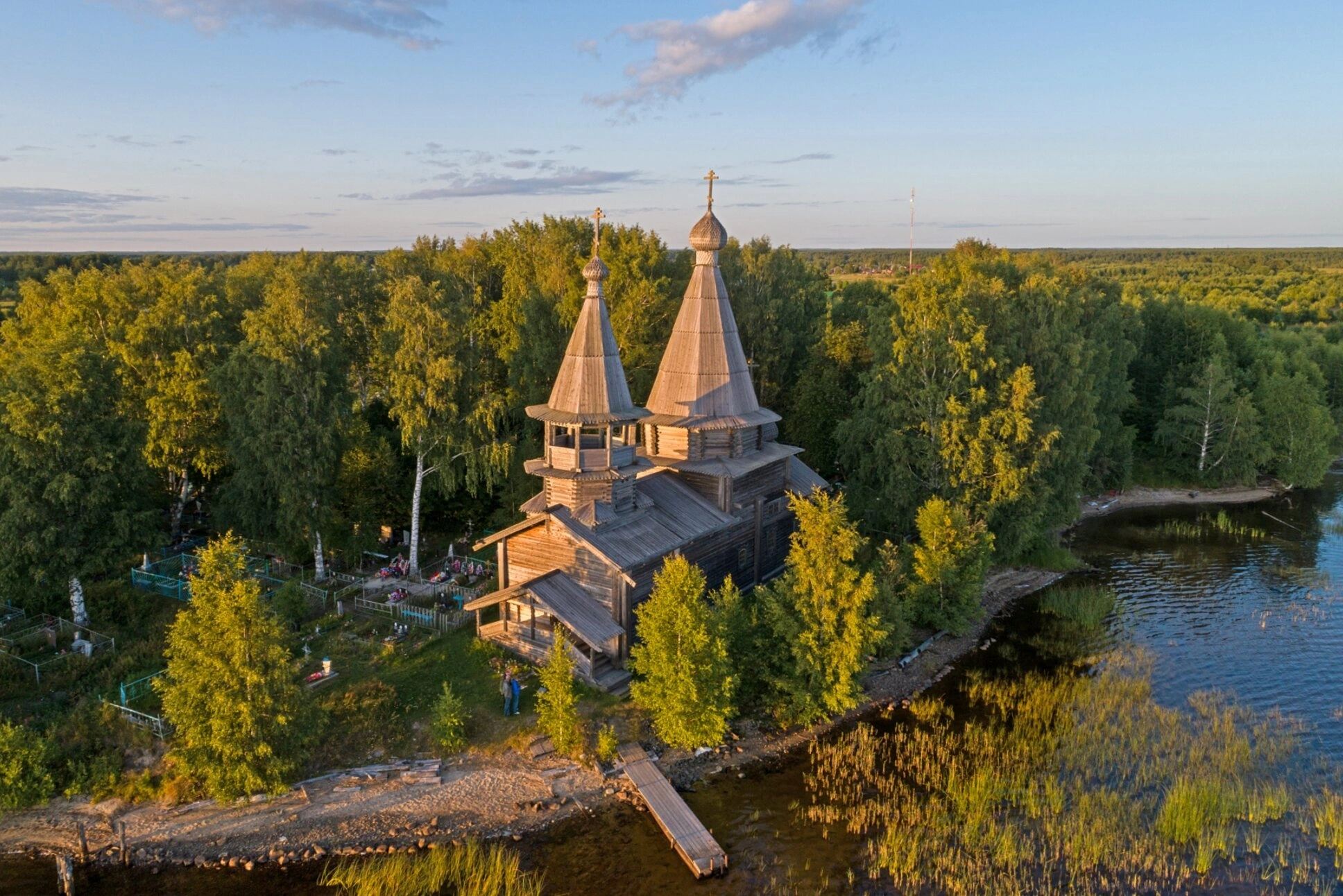 На представленной фотографии запечатлён вид с воздуха на один из древнейших православных храмов Русского Севера — церковь святых первоверховных апостолов Петра и Павла, более известную как Богоявленская церковь, в старинном селе Чёлмужи. С высоты птичьего полёта открывается величественная панорама храмового комплекса, возвышающегося на живописном берегу Повенецкого залива Онежского озера. Мягкий золотистый свет закатного или рассветного часа окутывает деревянные стены церкви, её стройный шатёр и шатровую же колокольню, освещая верхушки окружающих храм вековых хвойных и лиственных деревьев. Тёплые лучи подчёркивают благородную фактуру дерева и создают длинные, умиротворяющие тени. Чистое небо, окрашенное в нежные голубые и розоватые тона, служит идеальным фоном для этого духовного символа Заонежья.