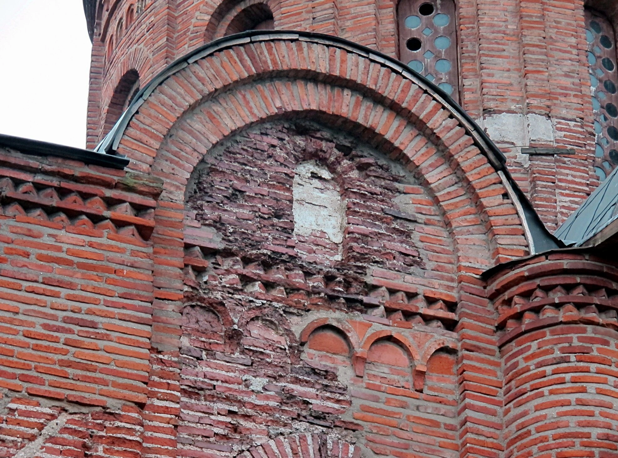 Основное внимание на снимке сосредоточено на деталях кирпичной кладки и архитектурных элементах северного фасада. Стена выполнена из красного кирпича с использованием характерной для домонгольского периода плинфы – тонкого плоского кирпича византийского образца. На фотографии отчетливо видны участки, где штукатурка частично утрачена, обнажая древнюю кладку, что позволяет изучать первоначальную технику строительства.