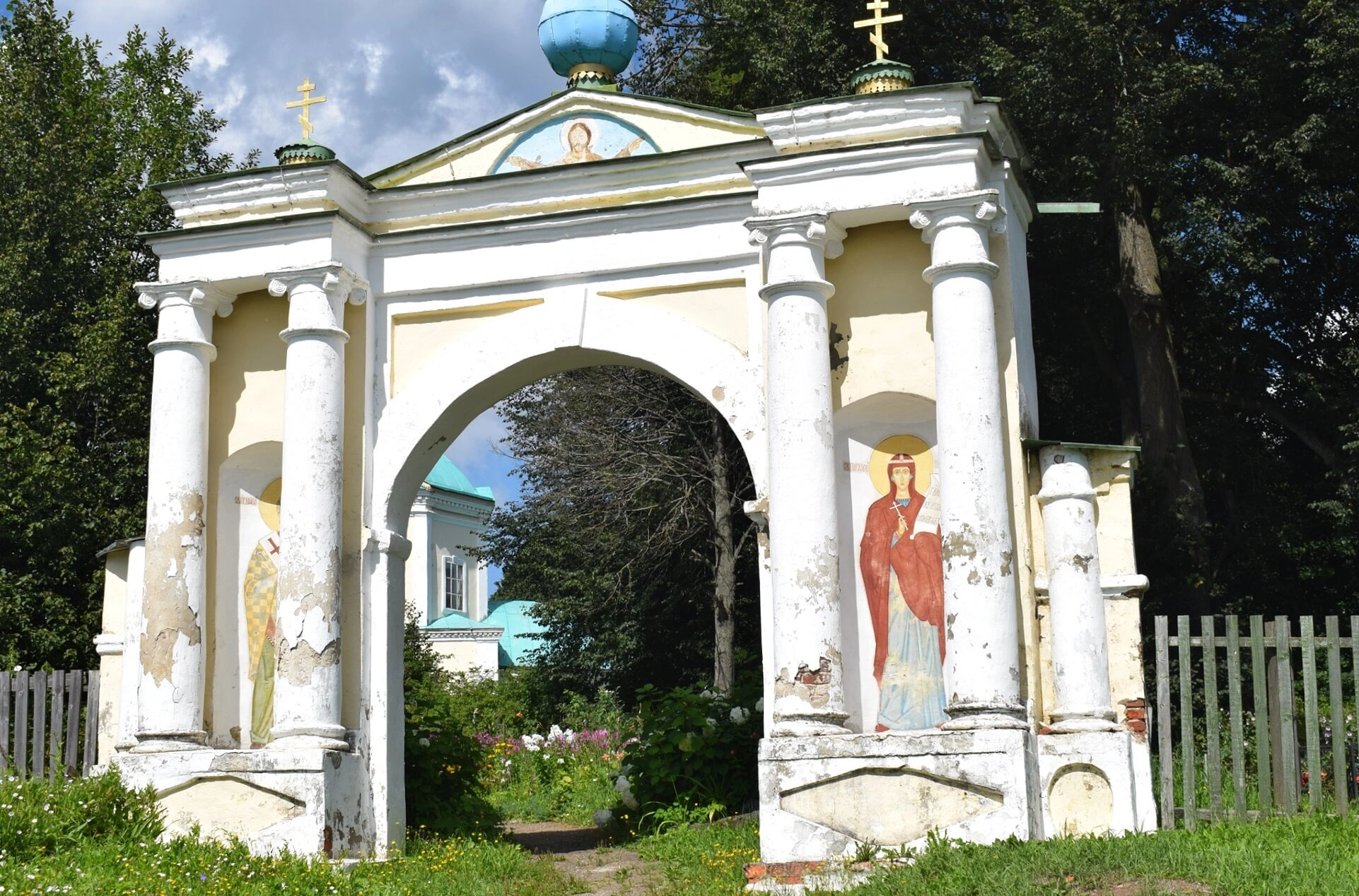 На фотографии запечатлены святые ворота с аркой, ведущие на территорию храмового комплекса Церкви Петра и Павла в селе Большое Село. Ворота, украшенные колоннами и увенчанные крестами, являются неотъемлемой частью церковной ограды и выполняют не только защитную, но и глубокую духовную функцию, символизируя вход в священное пространство. Сквозь арочный проём открывается вид на сам храм, что позволяет зрителю оценить его величие даже с некоторого удаления.