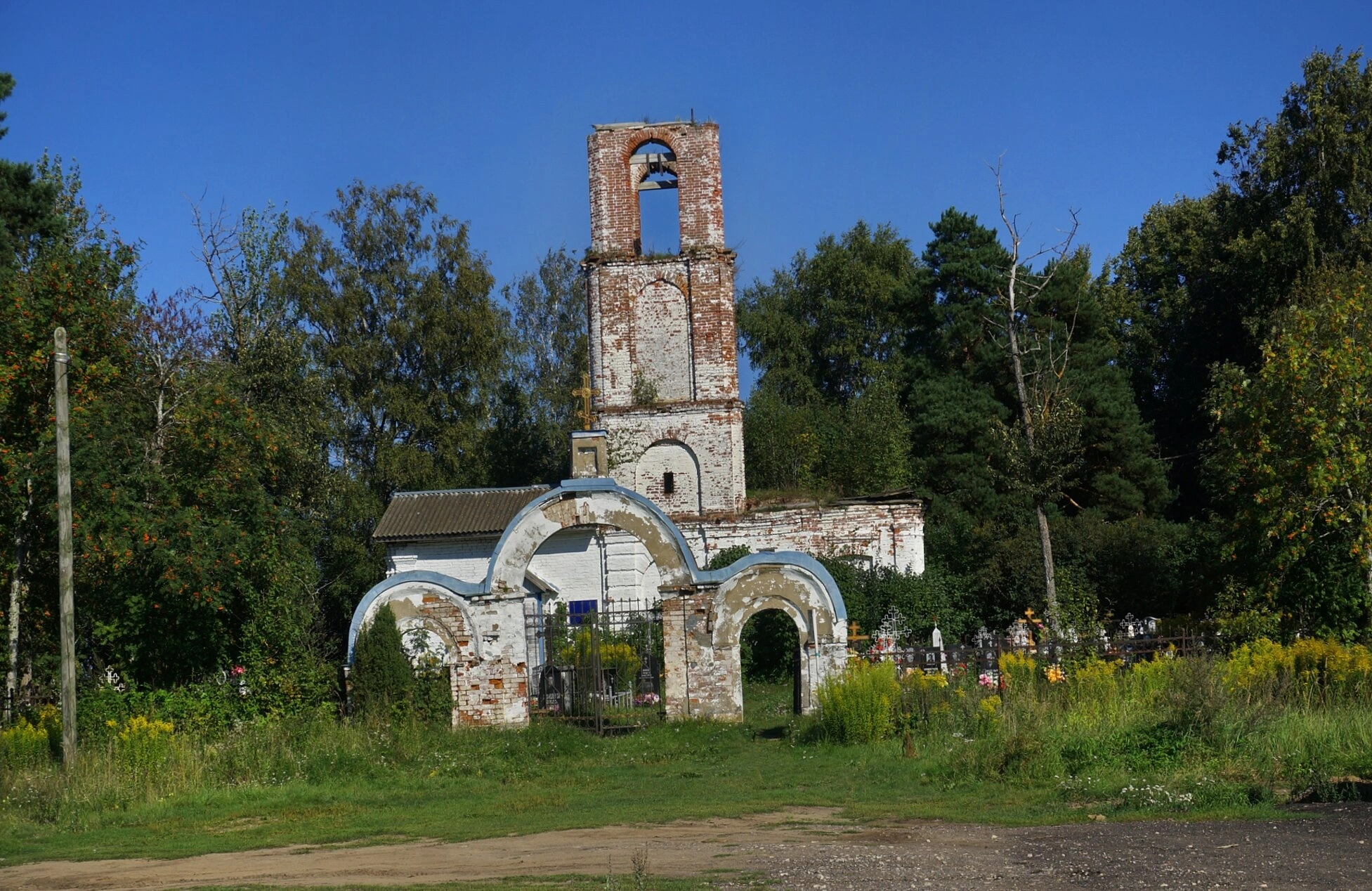 Храм окружён густой растительностью, что создаёт особую атмосферу единения разрушающегося творения рук человеческих и вечной природы. С обеих сторон от здания возвышаются лиственные и хвойные деревья, а перед фасадом простираются заросли высокой травы с полевыми цветами жёлтого цвета. На заднем плане просматривается церковное кладбище с сохранившимися крестами.