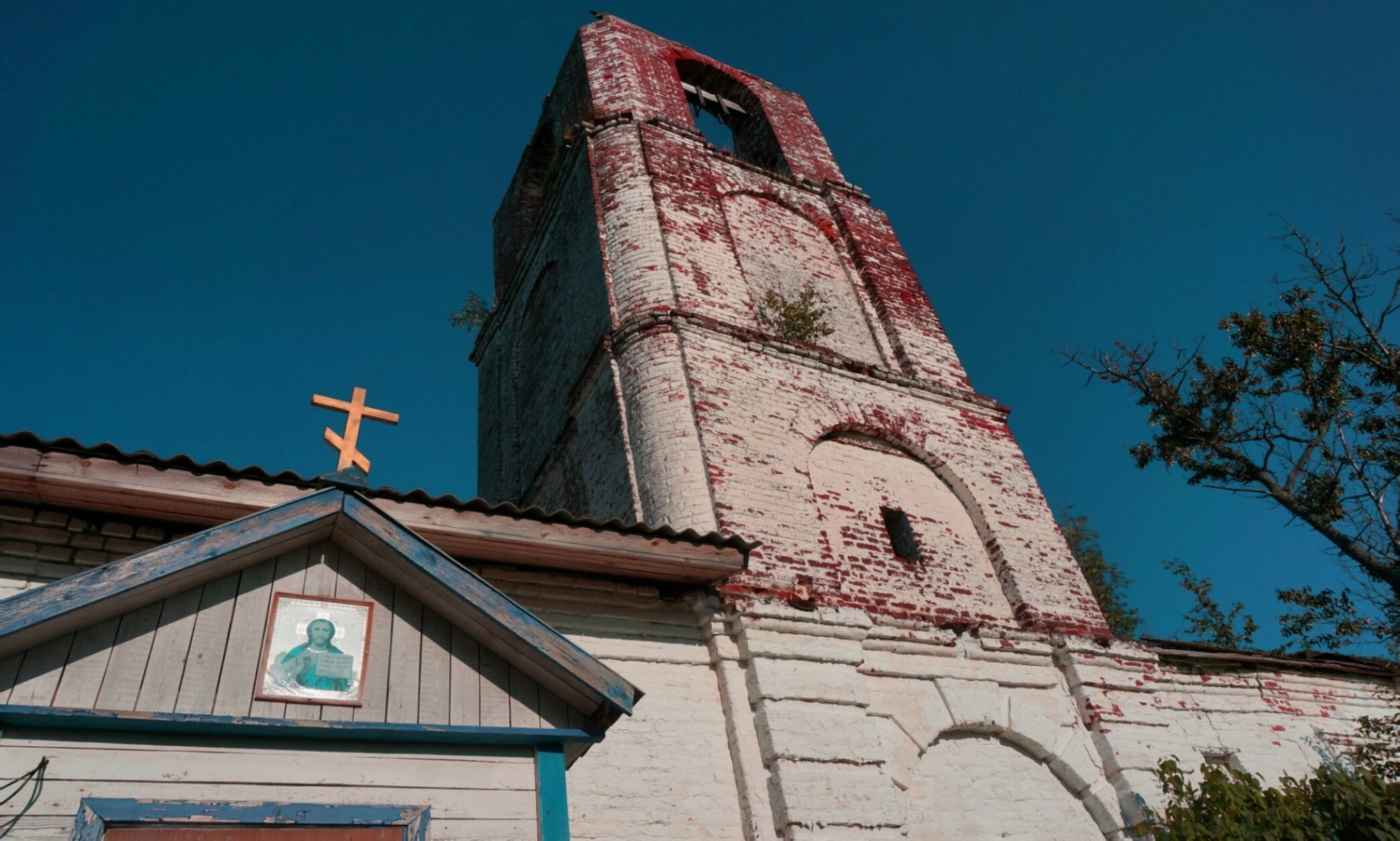 На заднем плане фотографии видно яркое синее небо без облаков, а с правой стороны — крона дерева, обрамляющая архитектурный ансамбль. Общий вид храма передаёт атмосферу духовного наследия, требующего сохранения и восстановления для будущих поколений.