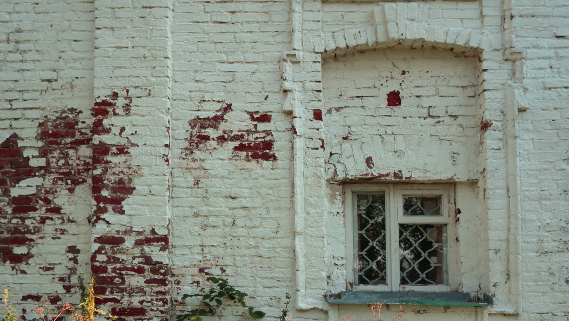 Фасад храма покрыт слоем белой штукатурки, которая местами значительно облупилась, обнажая историческую кирпичную кладку. Особенно интенсивно этот процесс проявился в левой части стены, где красный кирпич просматривается практически по всей поверхности. Подобное состояние штукатурного слоя свидетельствует о почтенном возрасте церковного здания и его богатой истории.