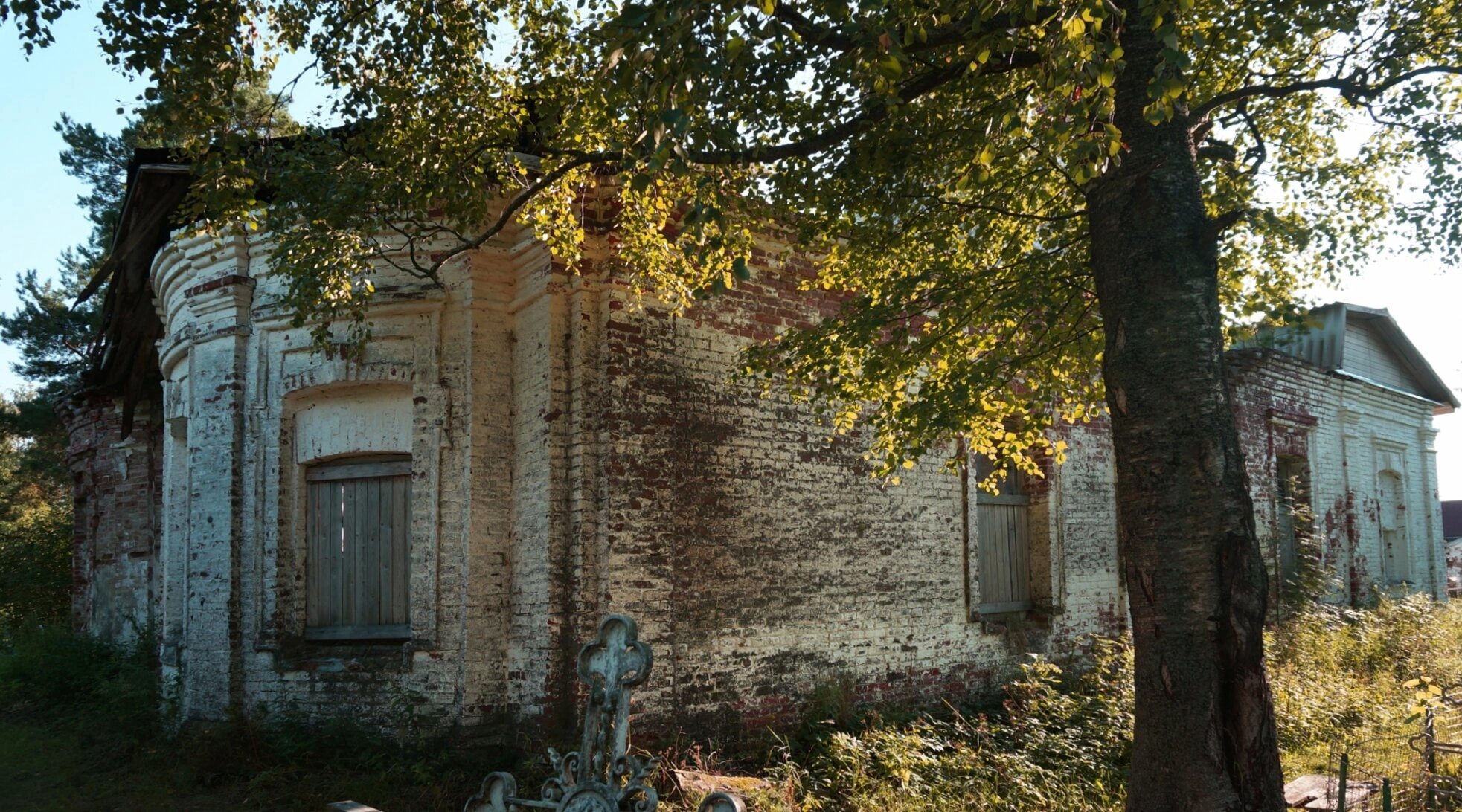 Примечательно, что все оконные проемы церкви заколочены деревянными досками, что свидетельствует о длительном запустении святыни. Храм находится в окружении вековых деревьев, среди которых особенно выделяется береза на переднем плане. Высокая трава и кустарники, окружающие здание, подчеркивают заброшенное состояние этого некогда действующего православного прихода.