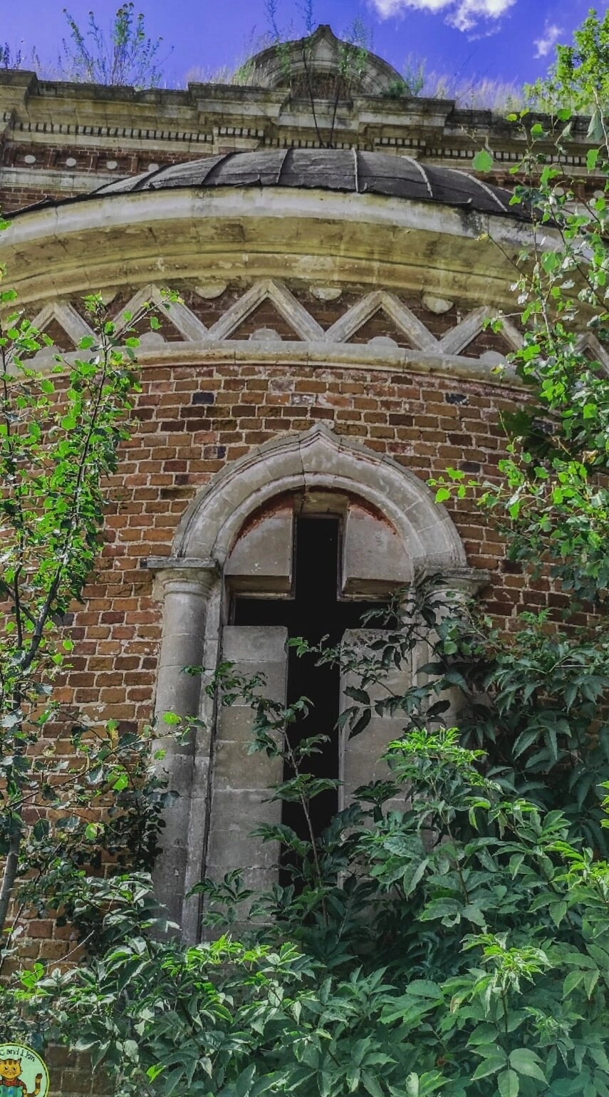 Сооружение выполнено из красного кирпича с выразительными архитектурными элементами, характерными для русских церковных построек. На изображении хорошо просматривается барабан церкви, увенчанный куполом, с сохранившимся декоративным карнизом и изящной кирпичной кладкой. Центральным элементом композиции служит арочное окно с каменными наличниками и колоннами по бокам, завершающееся крестообразным проемом, что подчеркивает культовое назначение здания.