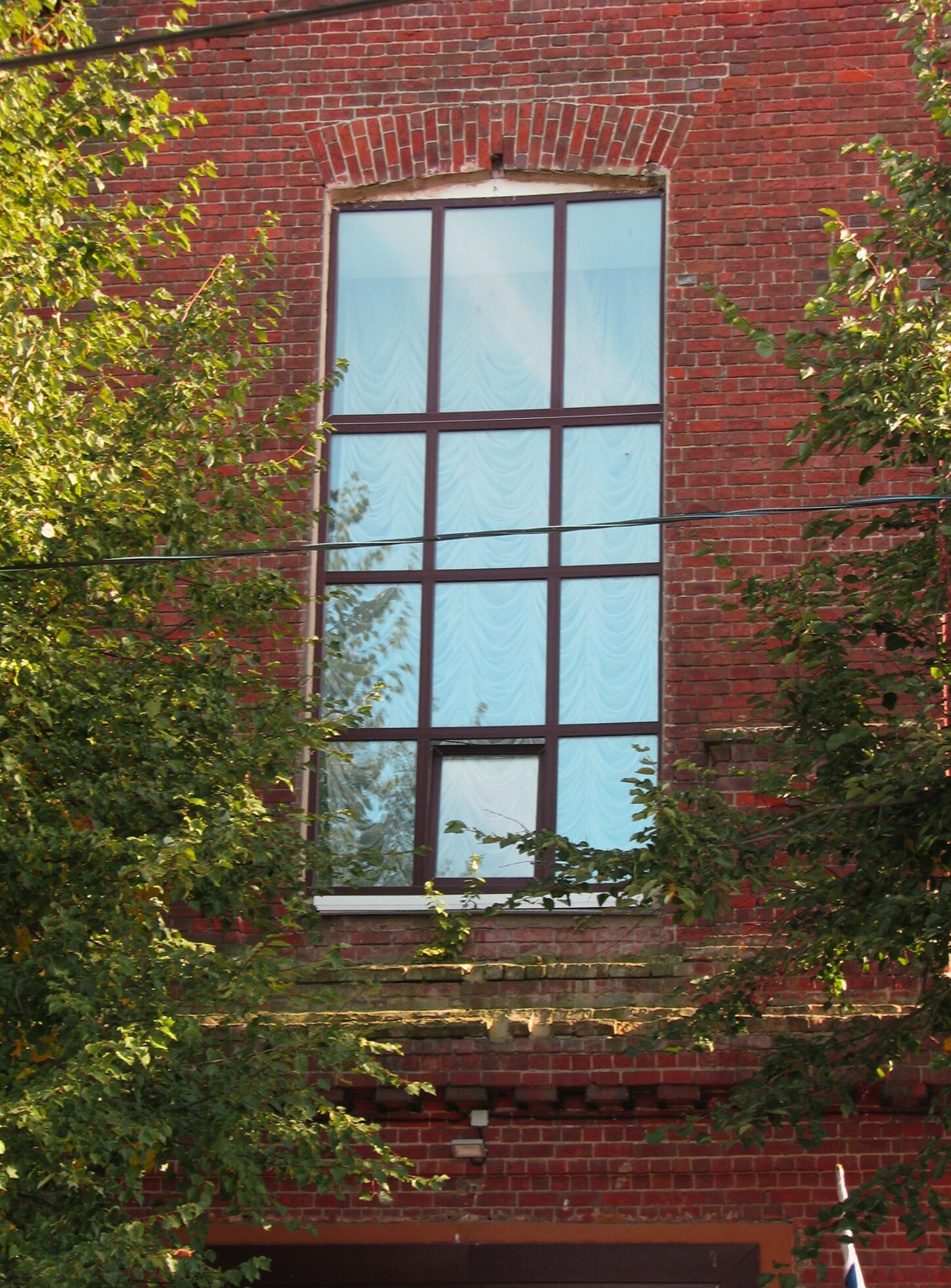 Кирпичная кладка стены, выполненная из красного кирпича, свидетельствует о мастерстве строителей прошлого. Каждый элемент кладки тщательно подогнан, создавая монолитную конструкцию, простоявшую не одно столетие. Окно с многочисленными секциями в коричневой раме характерно для храмовой архитектуры, где каждая деталь имеет символическое значение.