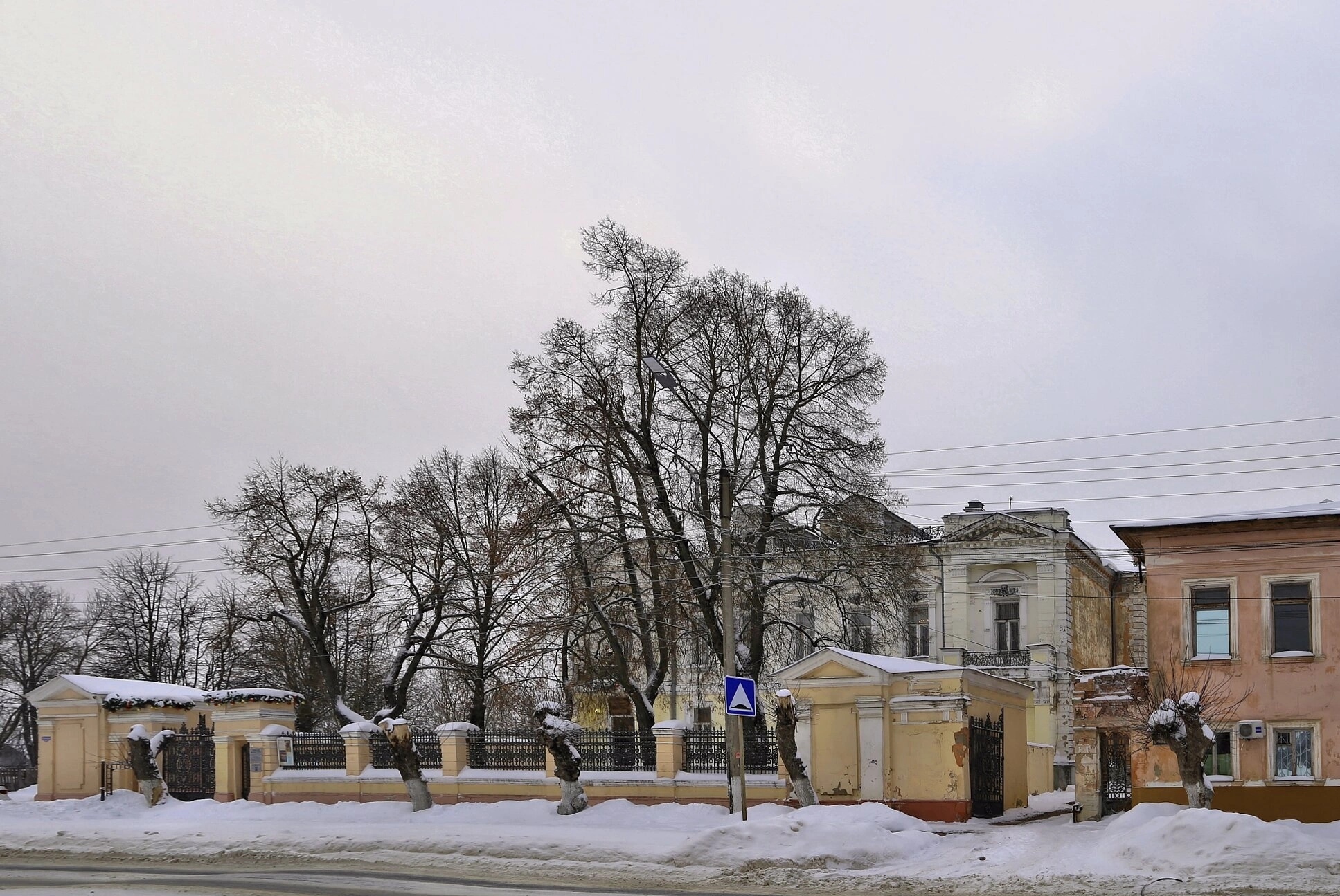 Перед зданиями проходит заснеженная дорога, вдоль которой установлен дорожный знак. Все сооружения окружены старинным ограждением с каменными колоннами и коваными элементами, характерными для русской усадебной архитектуры XIX века. Земля и крыши зданий покрыты ровным слоем снега, создающим атмосферу зимнего умиротворения и духовной сосредоточенности.