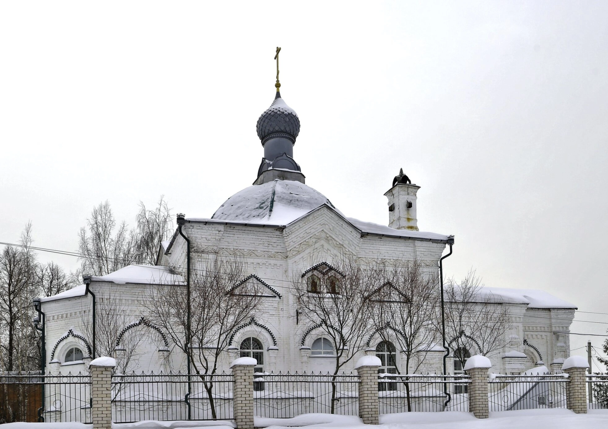 Окружение храма погружено в зимний покой. Земля, крыши и основание церковной ограды укрыты ровным снежным покровом. Невысокая ограда с кирпичными столбами и коваными звеньями очерчивает границу священного пространства. Голые ветви деревьев и кустарников на переднем плане лишь подчёркивают лаконичность и чистоту зимнего пейзажа. Пасмурное небо, затянутое светлыми облаками, наполняет снимок мягким рассеянным светом, свойственным для этого времени года, добавляя изображению атмосферу тишины и умиротворения, располагающей к созерцанию и молитве.