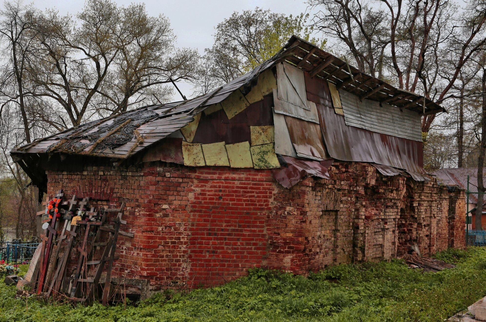 Окружающая территория сильно заросла травой, а голые ветви деревьев указывают на осенний или ранневесенний период съемки. С левой стороны от здания заметны сложенные старые доски и строительные материалы. Многие оконные и дверные проемы заложены кирпичом или иным образом заделаны, что характерно для заброшенных культовых сооружений.