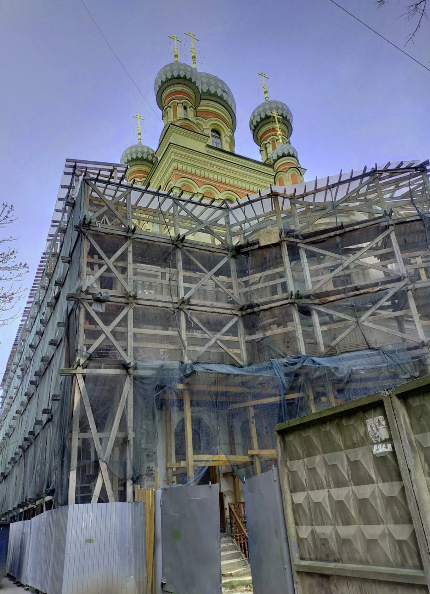 На фотографии запечатлён вид на Церковь Покрова Пресвятой Богородицы, что располагается на Боровой улице в Санкт-Петербурге. В момент съёмки храм находился на реставрации, о чём красноречиво свидетельствуют установленные строительные леса и укрывная сетка, скрывающая нижние ярусы фасада от внешних воздействий.