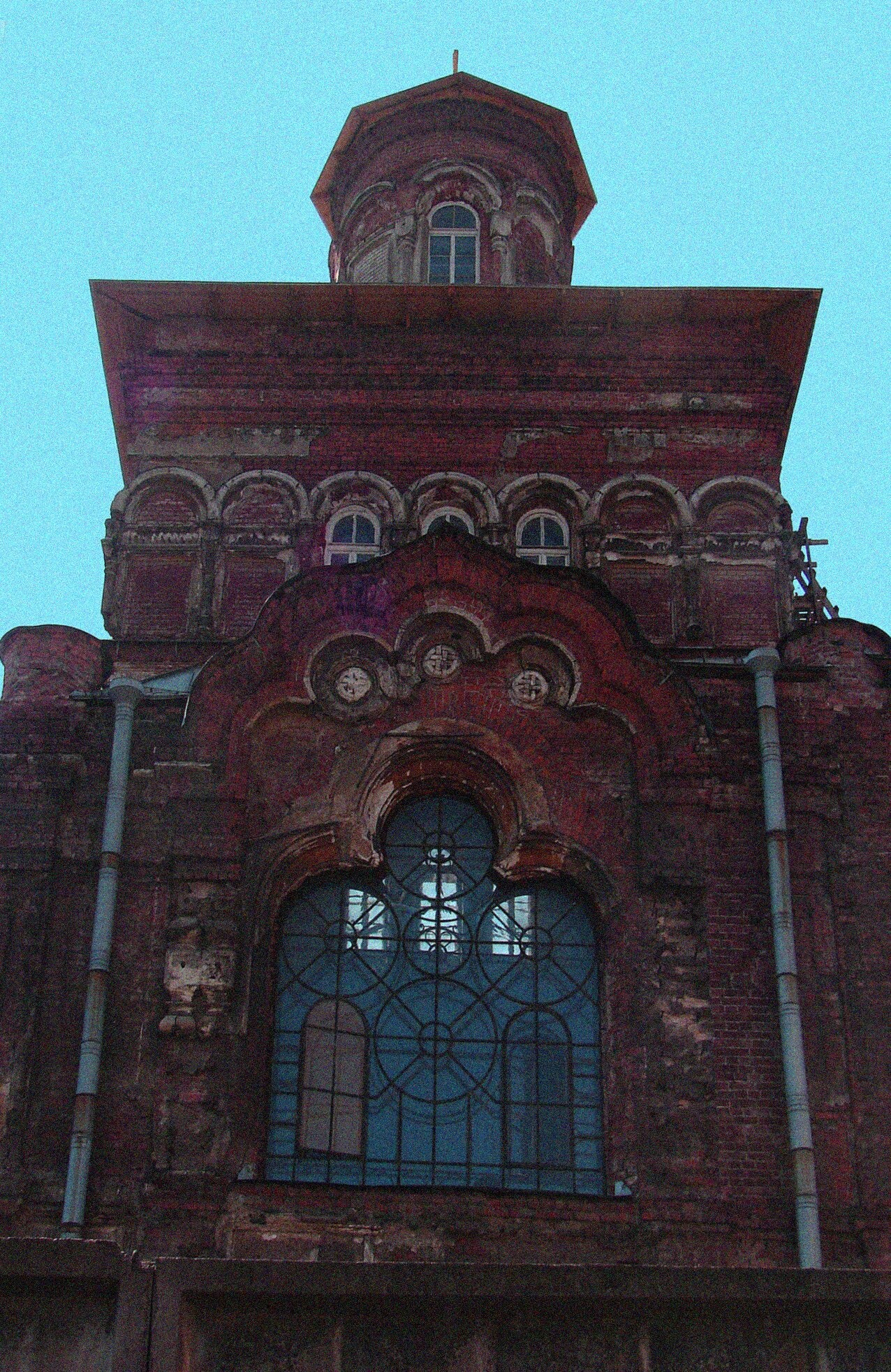 Кадр демонстрирует монументальный кирпичный фасад здания, который характеризуется строгим и величественным видом. Центральную часть композиции занимает большой оконный проём, украшенный синим витражем с крестообразными и геометрическими узорами. Над окном размещён декоративный элемент в форме кокошника, а выше расположены два арочных окна меньшего размера. Боковой фасад подчёркнут элементами водосточной системы, а в верхней части здания прослеживаются ряды декоративных арок и кирпичных узоров. Венчает композицию небольшой купол с оконным проёмом, что является частью восстановленного в 2019 году пятиглавия храма.